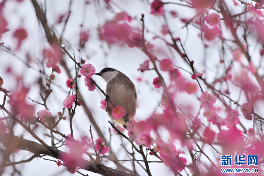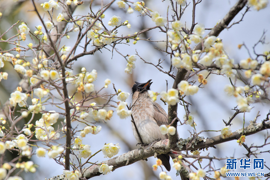 鳥兒停在盛開的梅樹枝頭(1月26日攝)。新華網發(吳再忠 攝)