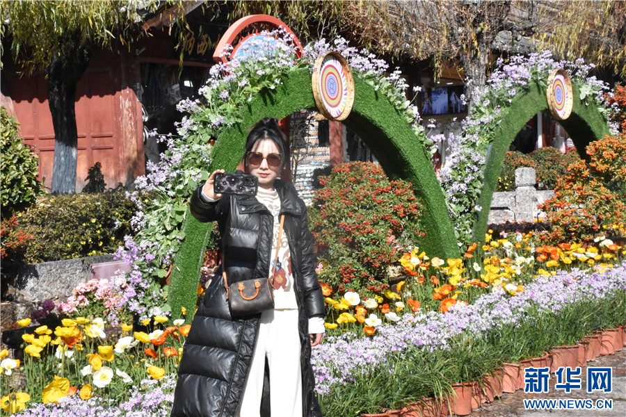 游客正在觀賞麗江古城春節花展(2月1日攝)。新華網發(和潤仙 攝)