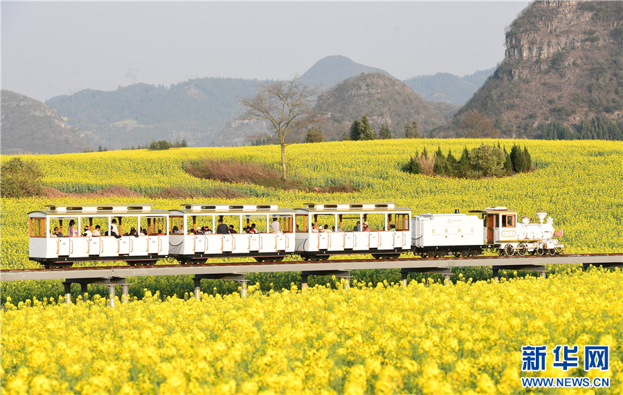 游人在云南省羅平縣乘坐小火車穿越油菜花海(2月20日攝)。新華網發(毛虹 攝)