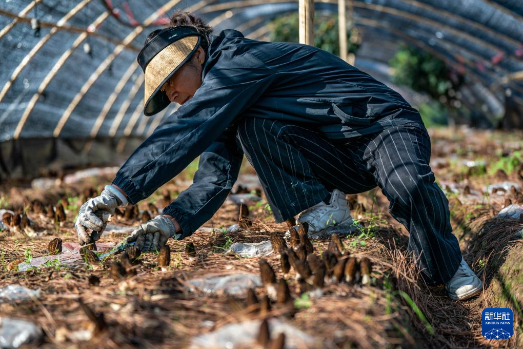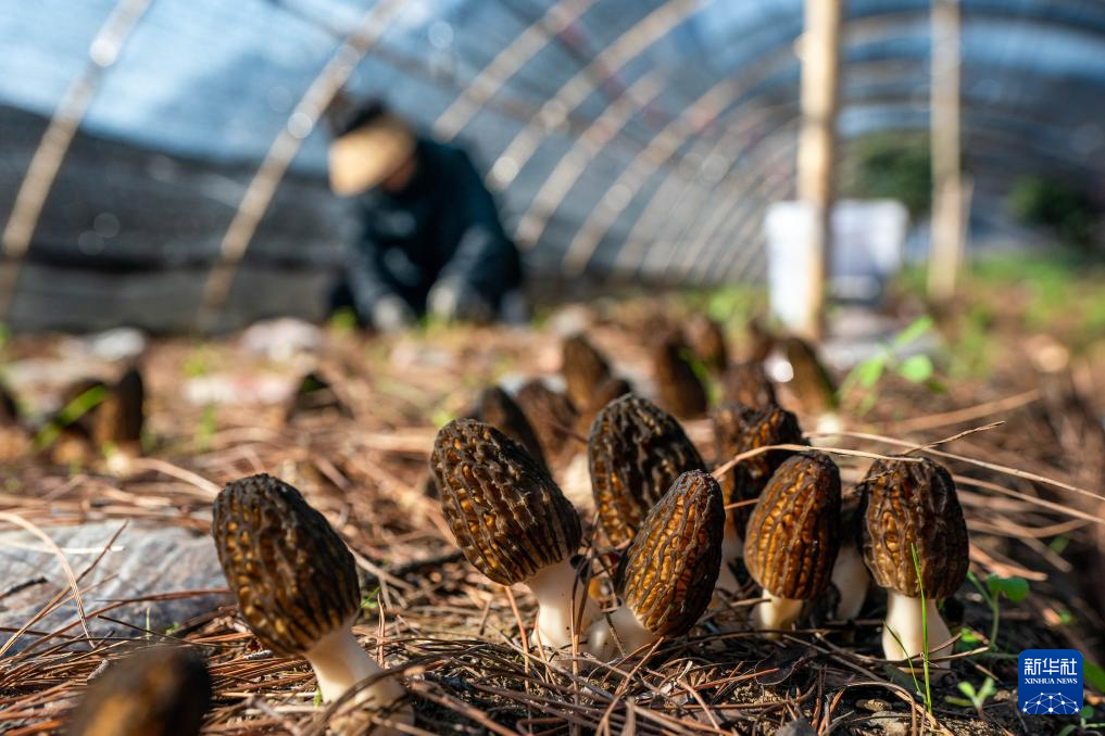 3月10日,在香格里拉市三壩納西族鄉江邊村,村民在大棚里采收羊肚菌。