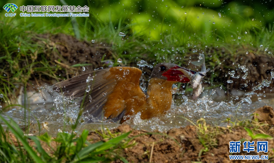 鸛嘴翡翠進食瞬間(3月30日攝)。新華網發(朱邊勇 攝)