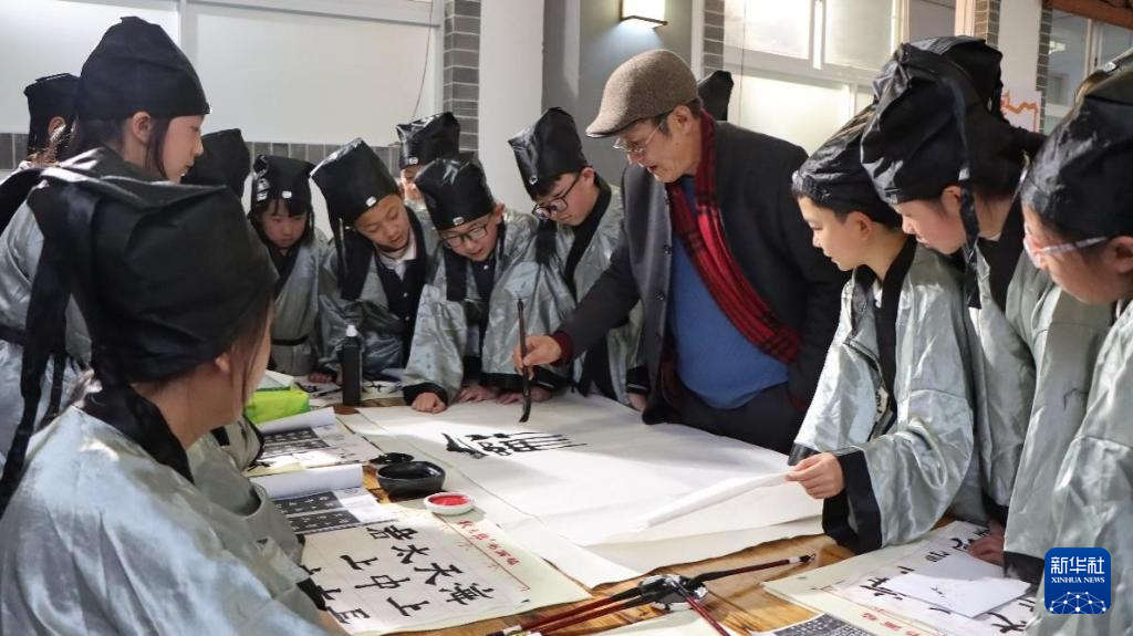 云南曲靖第二小學的學生在上爨體書法課(1月30日攝)。新華社發(傅保中 攝)