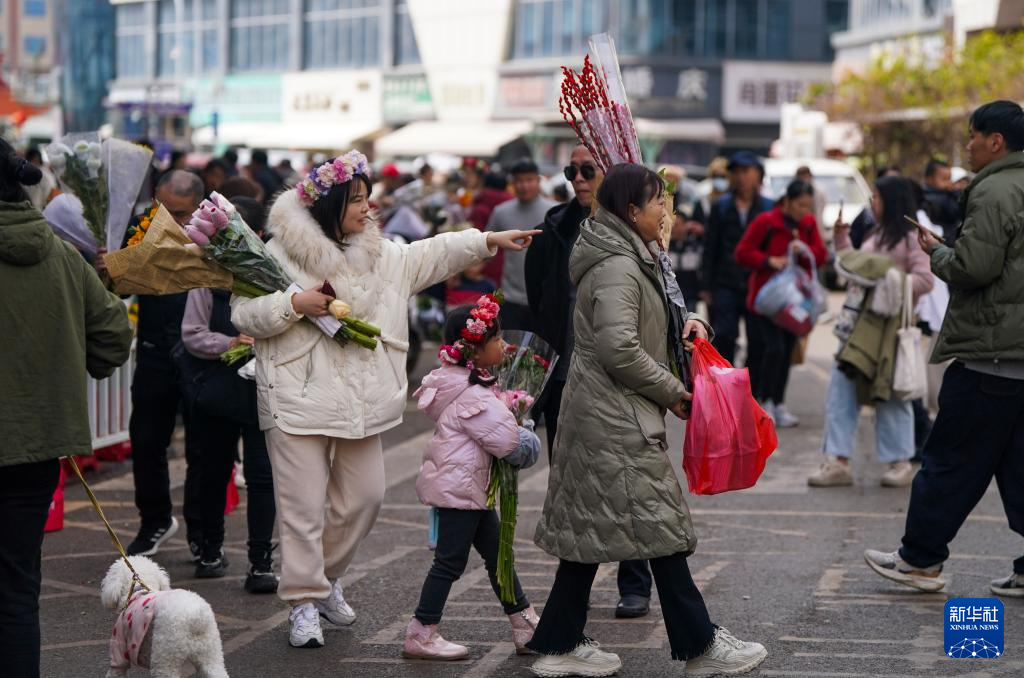 2月12日,游客在昆明斗南花卉市場游玩買花。新華社記者陳欣波 攝