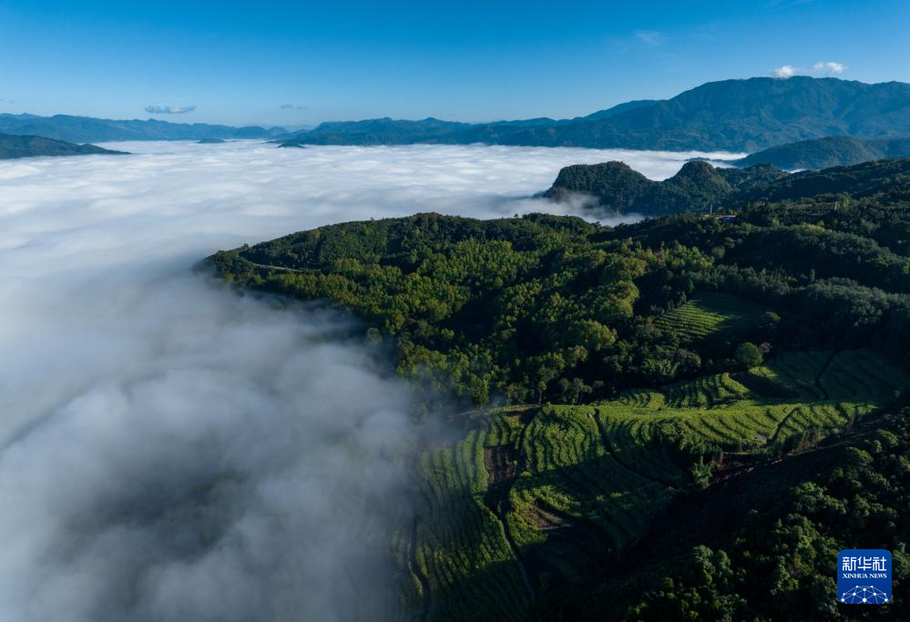這是在云南省臨滄市滄源佤族自治縣拍攝的云海間的茶園(資料照片)。新華社記者 江文耀 攝