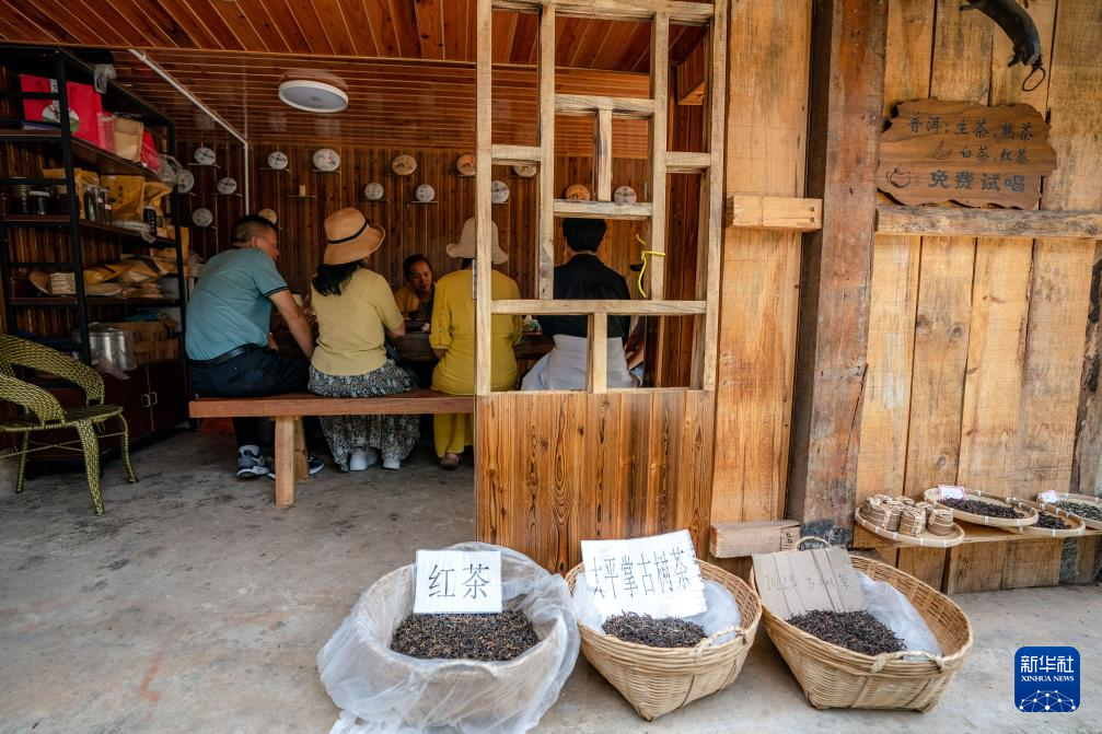 游客在景邁山糯崗古寨品嘗普洱茶飲(資料照片)。新華社記者 胡超 攝