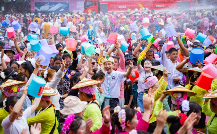 4月14日,“大美隴川”2024年傣族德昂族潑水節鄉村潑水狂歡活動,在云南省德宏傣族景頗族自治州隴川縣章鳳鎮拉勐村舉行。伴著陣陣鼓聲,人們跳起歡樂的“嘎伴光”,男女老少間互相潑水,互祝吉祥、幸福、健康?,F場,祝福的水花四處飛濺,到處洋溢著濃厚的節日氣氛。(完)(李易晨 尹興朋)