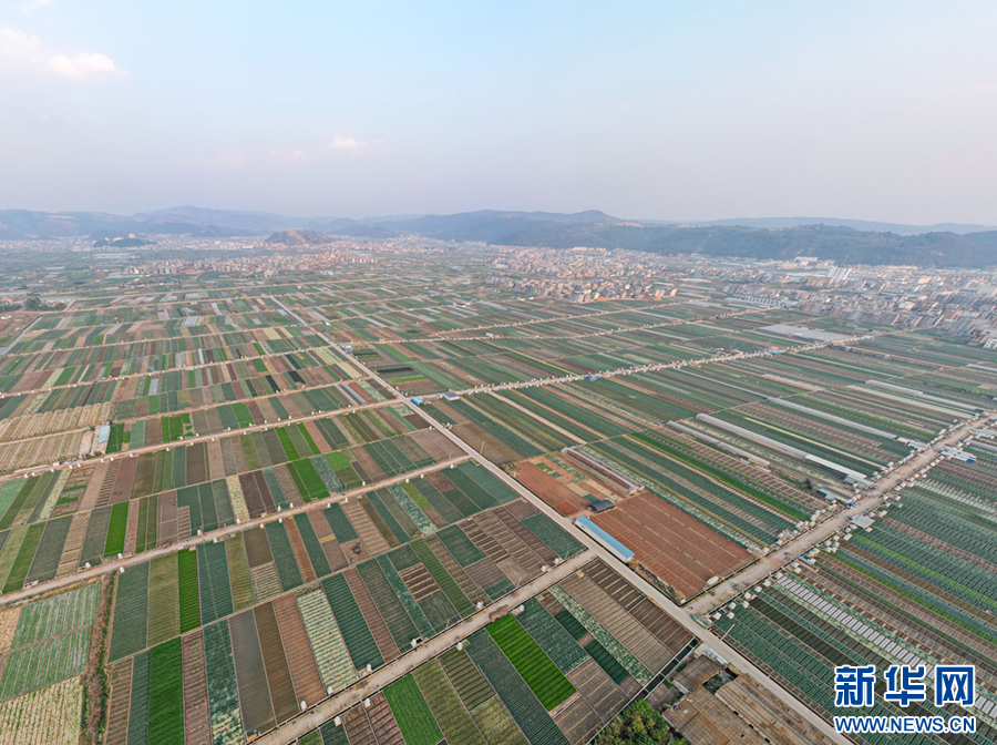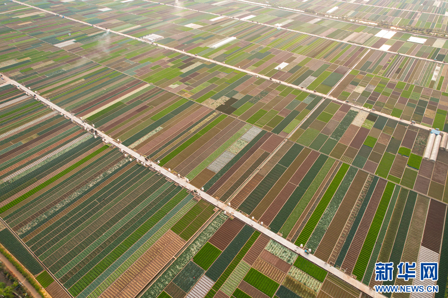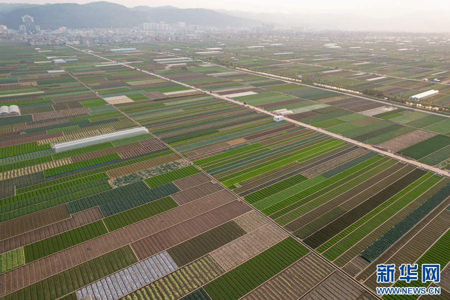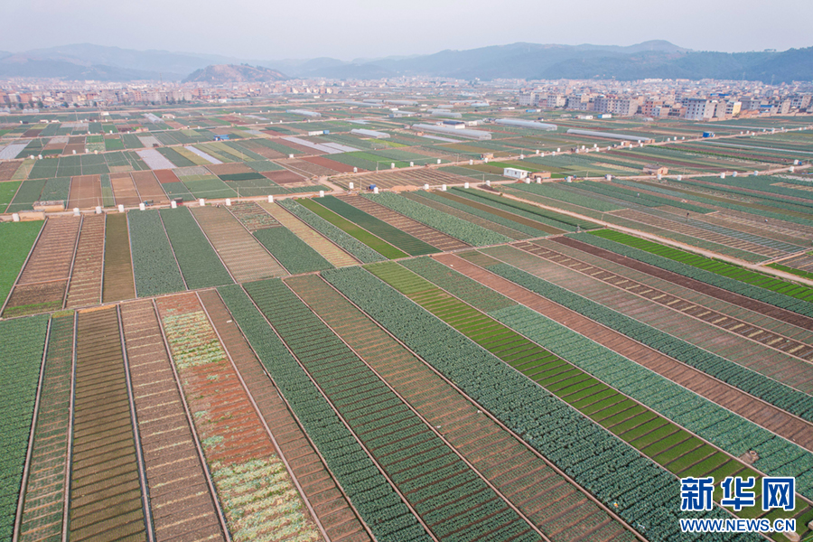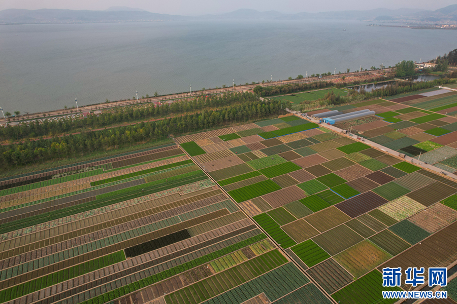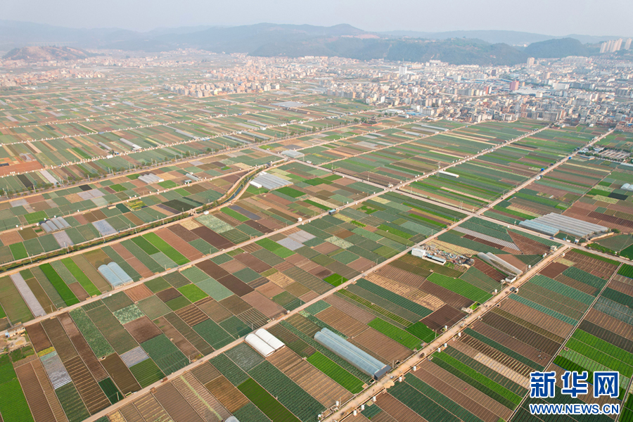 暖春時節,云南省玉溪市通??h蔬菜種植基地,壓茬輪種的各類蔬菜長勢喜人,平整規范的土地阡陌縱橫、色彩斑斕,與村莊、山巒、湖泊構成一幅美麗的田園畫卷。新華網發(楊俊鵬 攝)