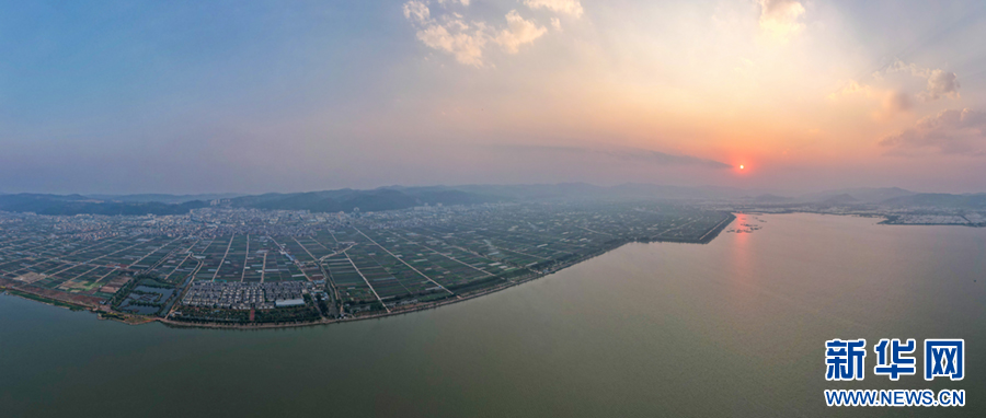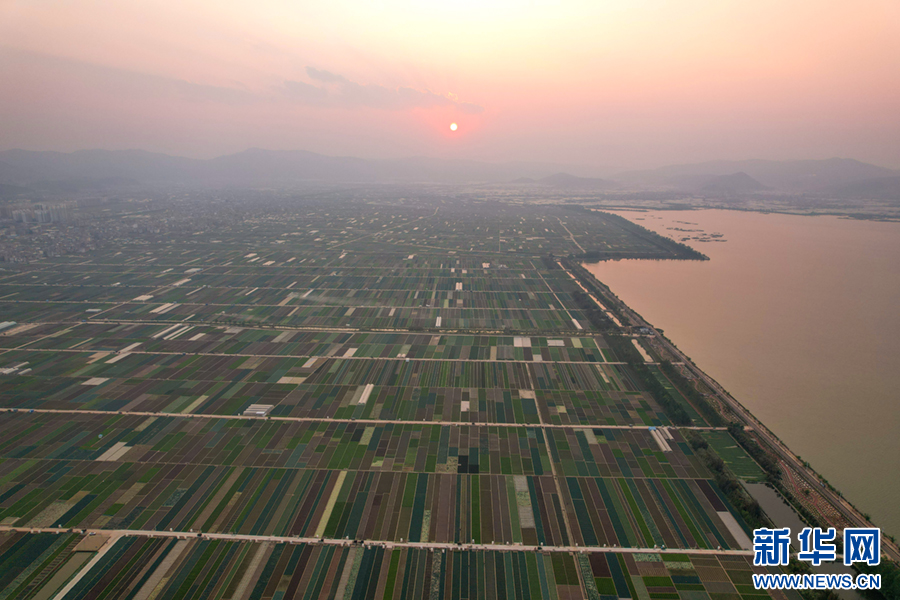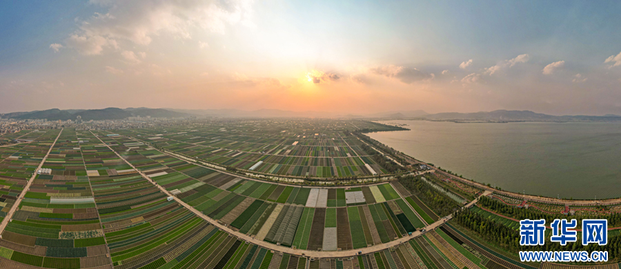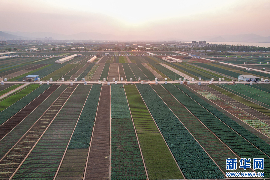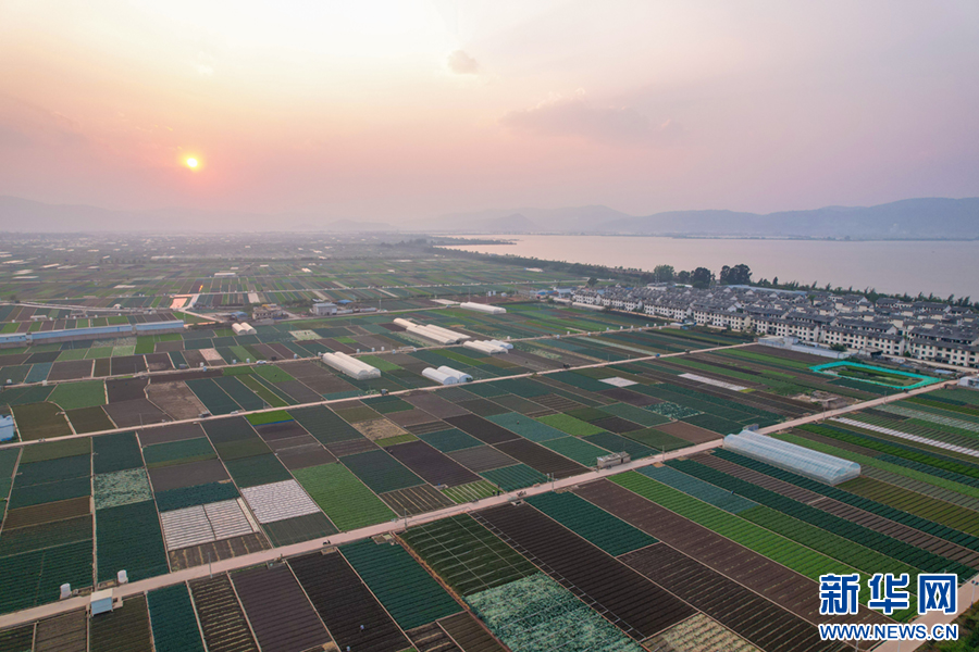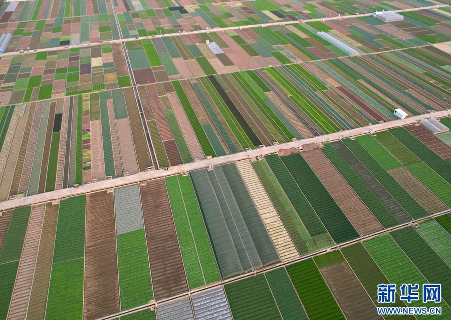 暖春時節,云南省玉溪市通??h蔬菜種植基地,壓茬輪種的各類蔬菜長勢喜人,平整規范的土地阡陌縱橫、色彩斑斕,與村莊、山巒、湖泊構成一幅美麗的田園畫卷。新華網發(楊俊鵬 攝)