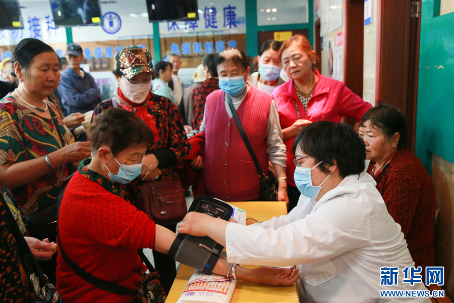 在云南省曲靖市沾益區西平街道社區衛生服務中心,醫護人員為老年人測量血壓(4月10日攝)。新華網發(楊俊鵬 攝)