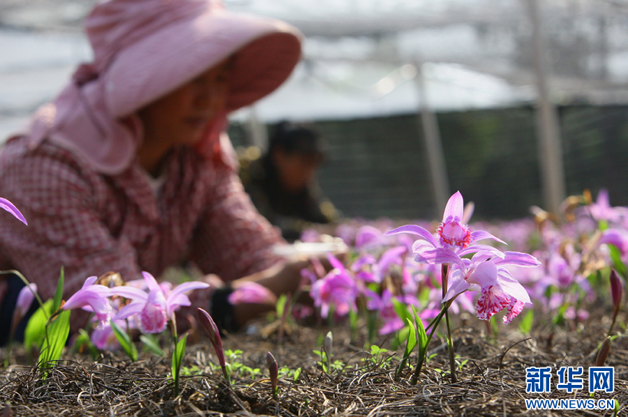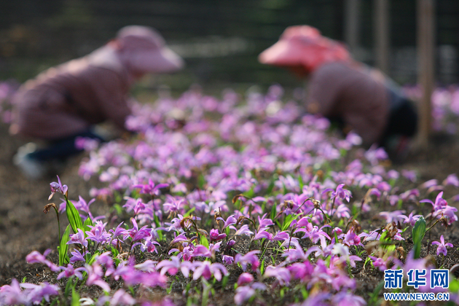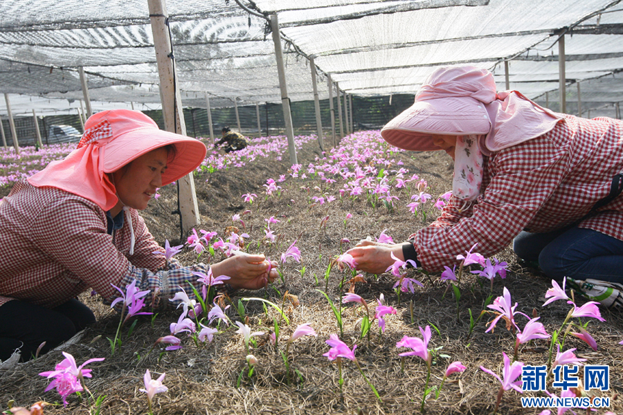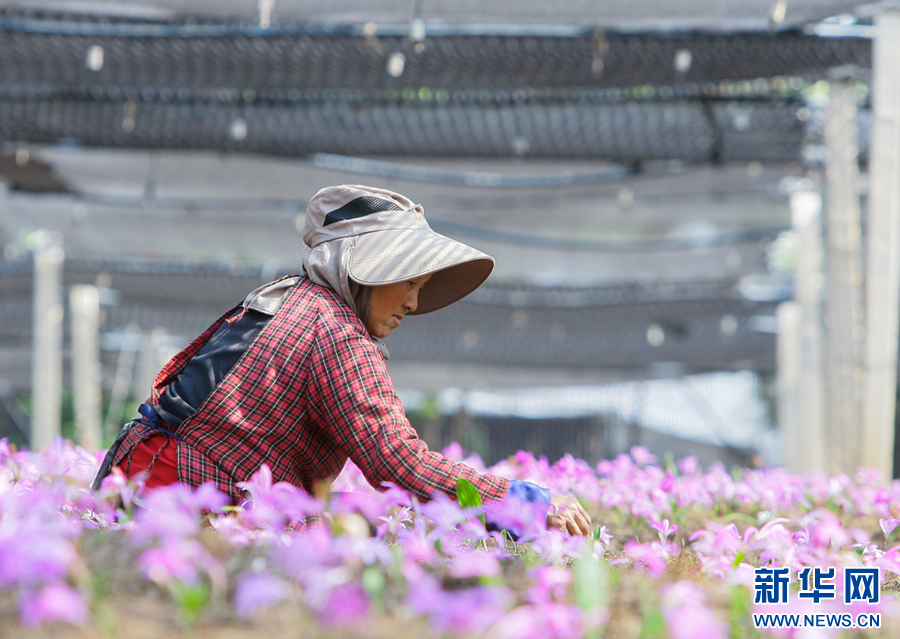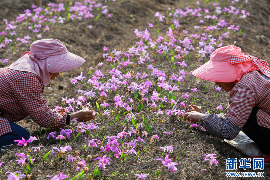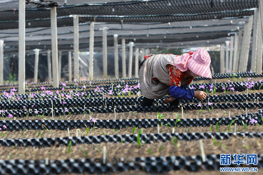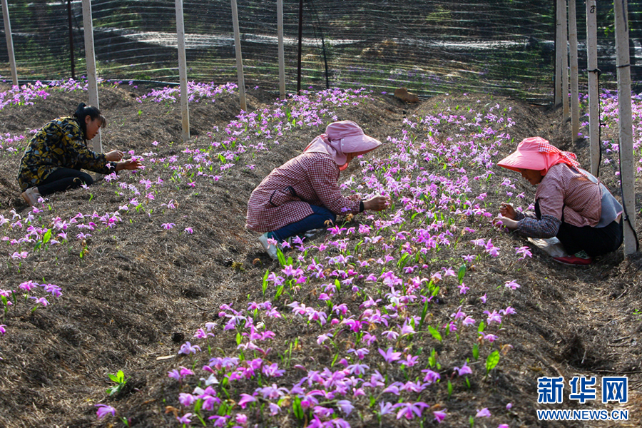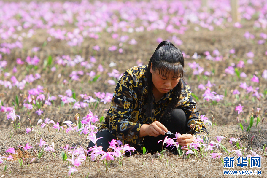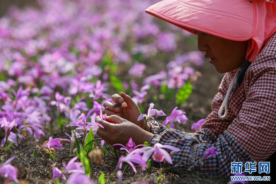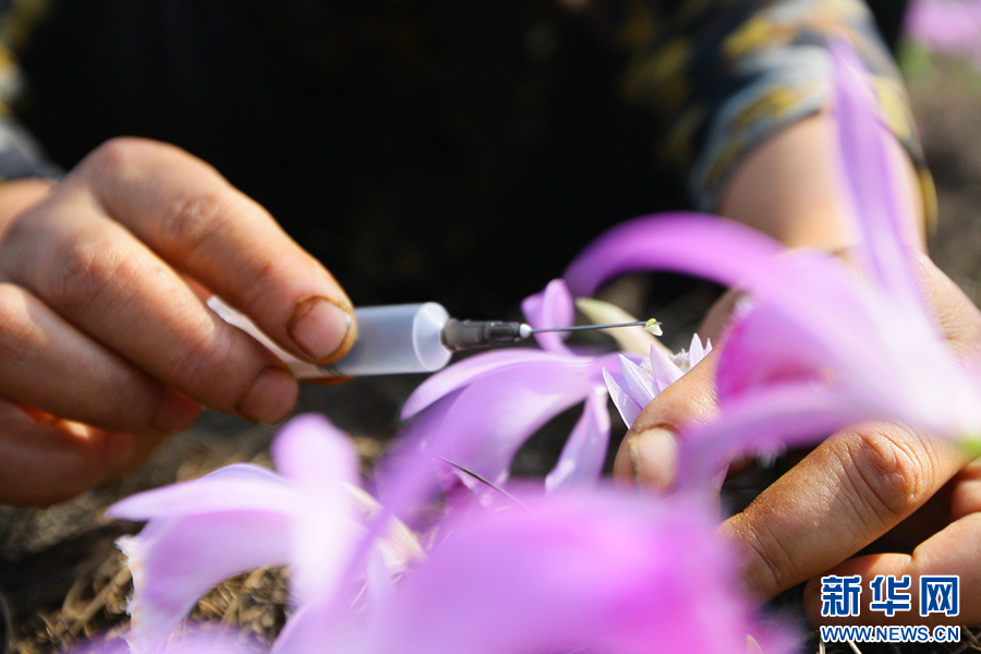 云南省曲靖市沾益區盤江鎮中藥材種植基地,務工人員給冰球子花授粉(4月11日攝)