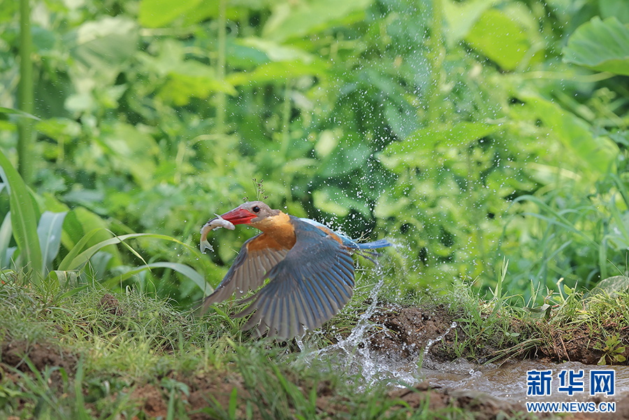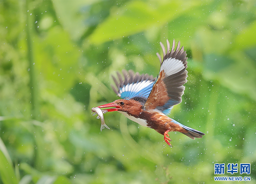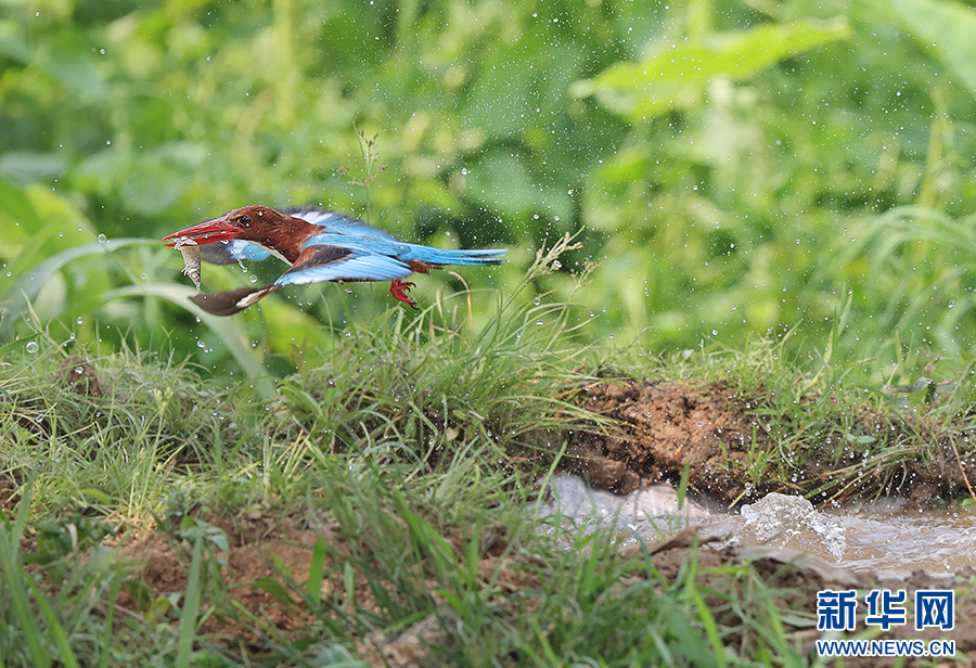 鸛嘴翡翠百發百中,叼魚急速起飛(4月15日攝)。新華網發(楊學飛 攝)