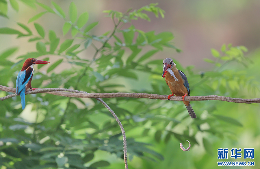 白胸翡翠叼著小魚去喂雌鳥(4月15日攝)。新華網發(楊學飛 攝)