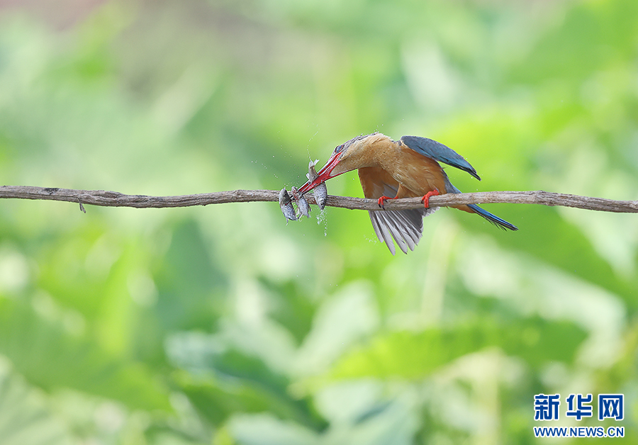 鸛嘴翡翠正在玩耍小魚(4月15日攝)。新華網發(楊學飛 攝)