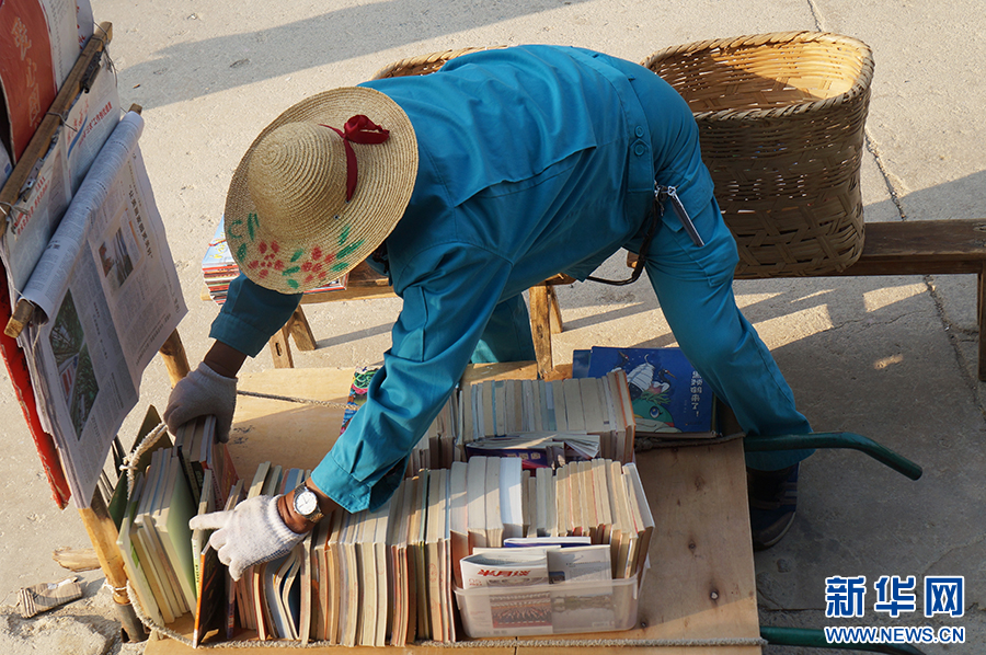 一個多小時后,他換上郵政工作服,從家中拉上小車,去農家書屋帶上一百多本圖書,開始到小集市“擺書攤”……