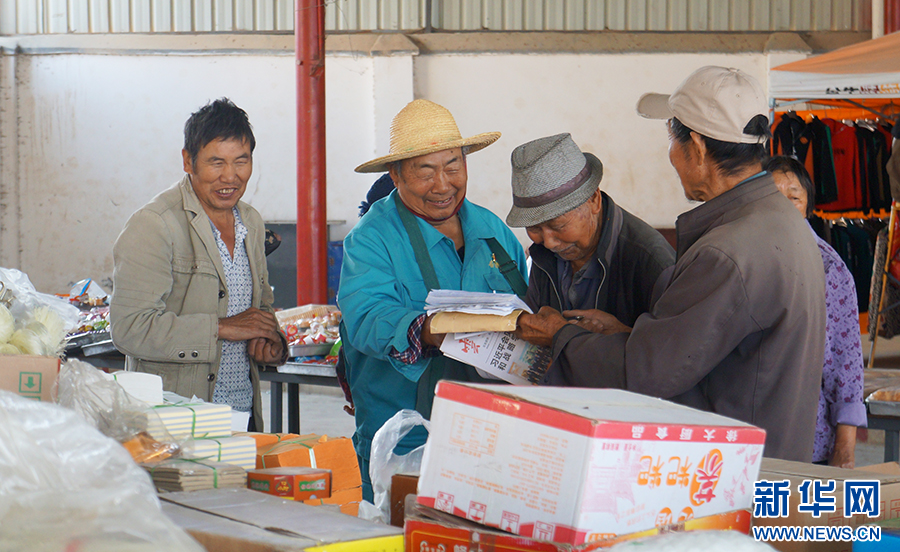 李存德給村民送書(4月8日攝)。新華網 范芳鈺 攝