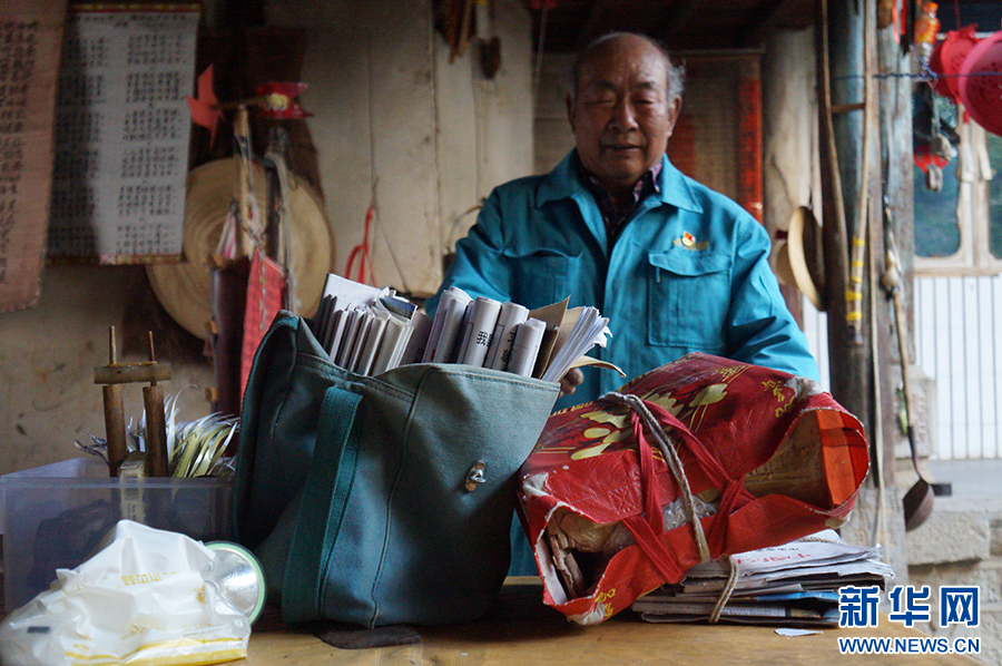 李存德在家里整理報紙(4月7日攝)。新華網 范芳鈺 攝