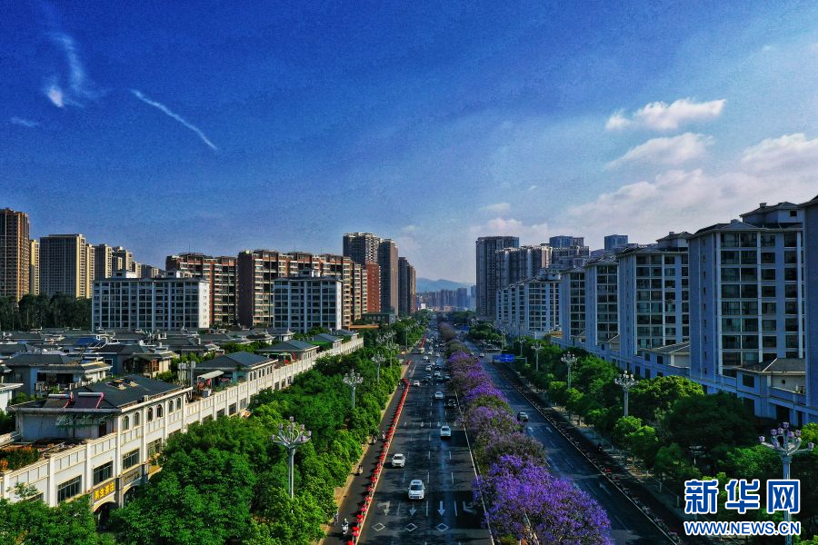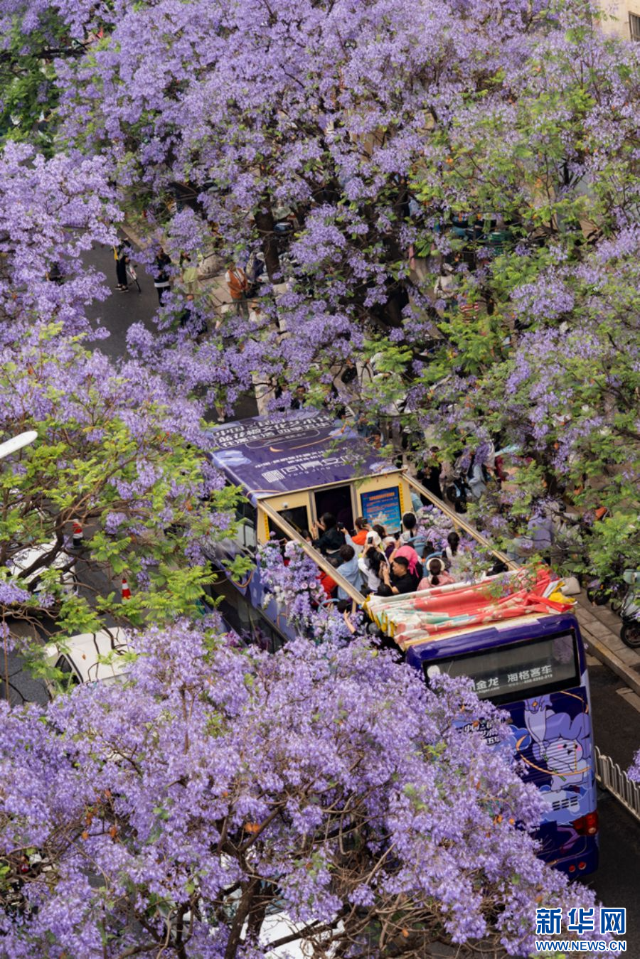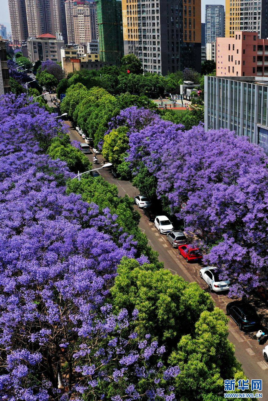 云南省昆明市北京路上,道路兩旁藍花楹盛開(4月21日攝)。新華網發(張麗 攝)