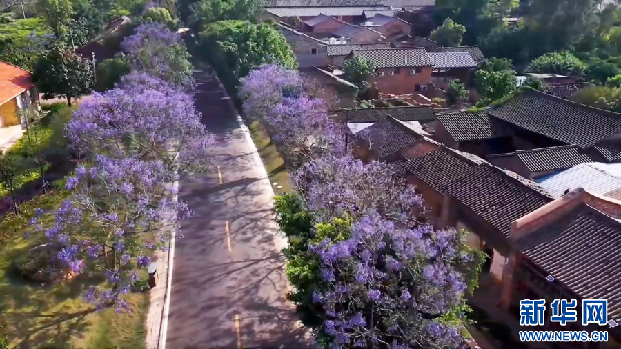 云南省紅河州蒙自市村莊道路兩旁的藍花楹(4月12日攝)。新華網發(羅浩元 攝)