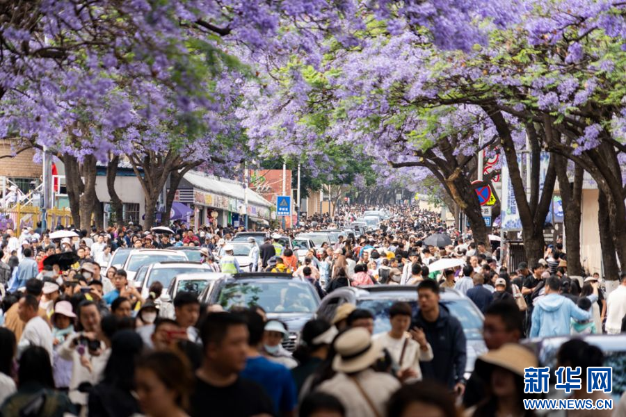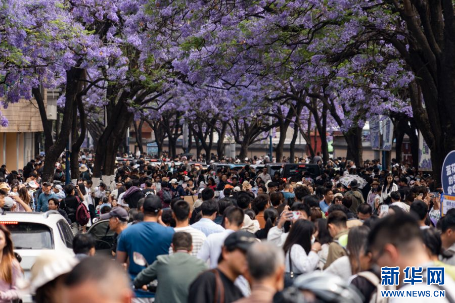 前來云南省昆明市觀賞藍花楹的游客(4月21日攝)。新華網發(鄭益 攝)