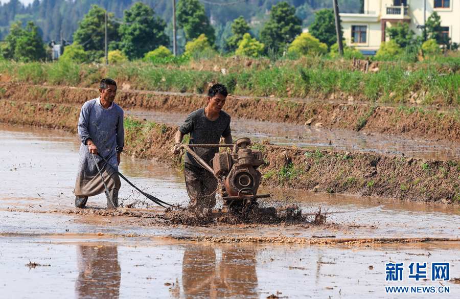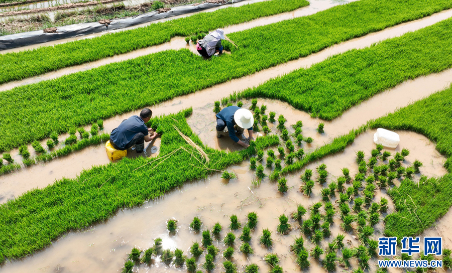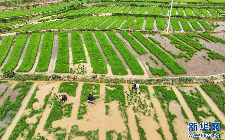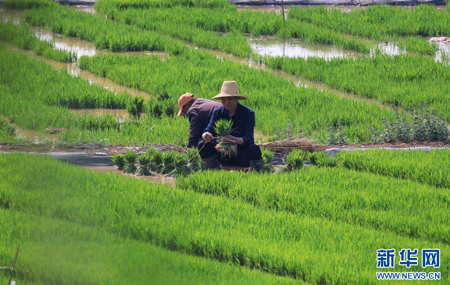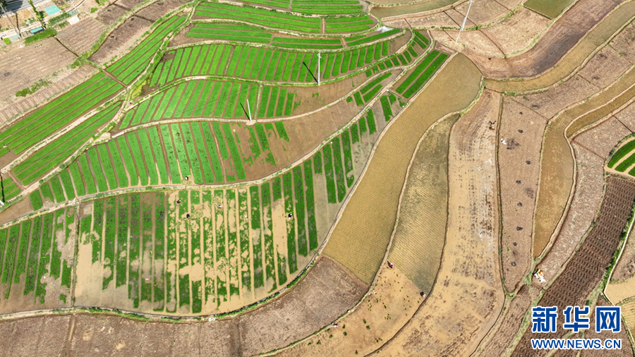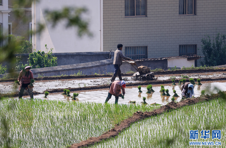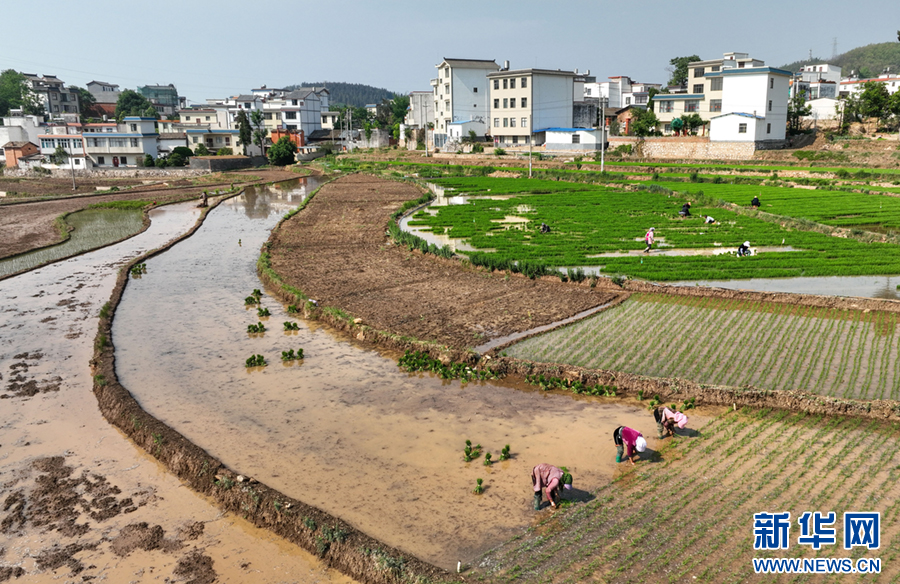 春末,在云南省曲靖市沾益區天生壩村,村民們搶抓農時,翻犁田地、拔秧、插秧,田間地頭一派忙碌景象,勞作的村民與翠綠的秧苗共同勾勒出一幅田園勞作圖。新華網發(孫文來 攝)