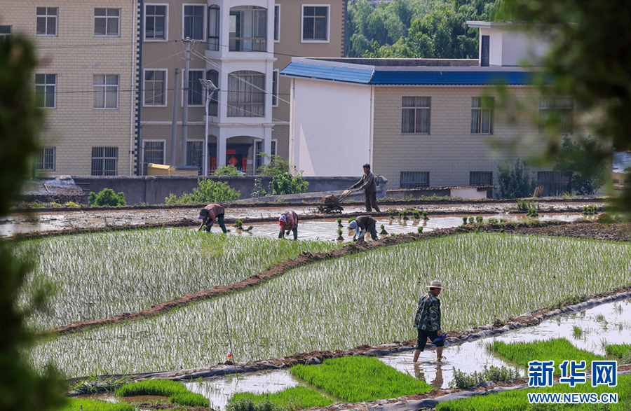 云南省曲靖市沾益區天生壩村,村民在栽插秧苗(4月28日攝)。新華網發(孫文來 攝)