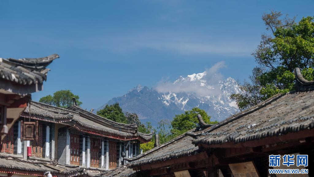 麗江古城的飛檐翹角和玉龍雪山相互掩映(資料圖)。新華社記者 胡超 攝
