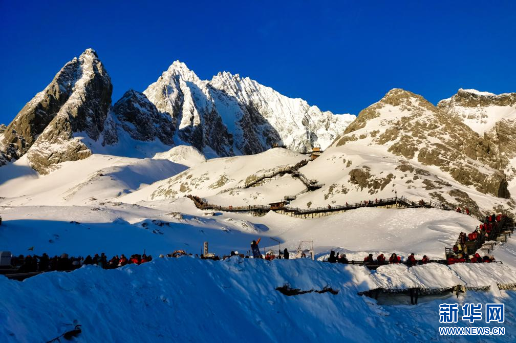 雪山巍峨聳立,皚皚白雪映照著藍天,成為無數徒步愛好者和攝影愛好者的朝圣之地。游客們乘坐纜車,從山下的“春天”到山頂的“冬天”,在冰雪中俯瞰麗江城鄉,頓生暢快淋漓之感。