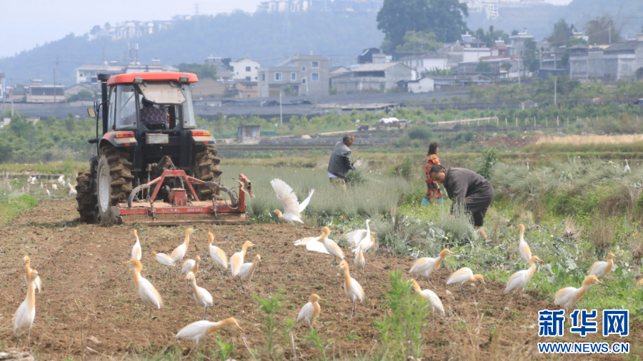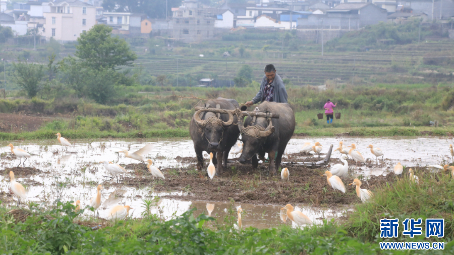 和順鎮農民忙農耕,白鷺來作伴(5月8日攝)。新華網發(龔祖金 攝)