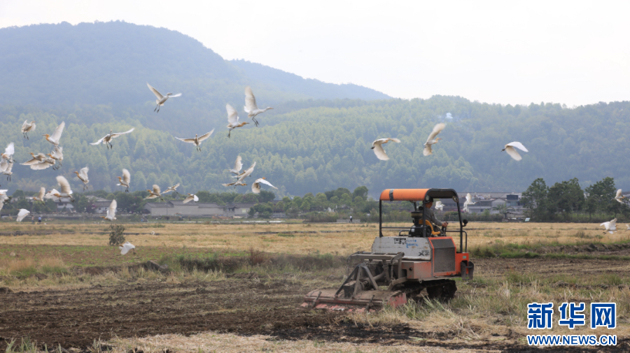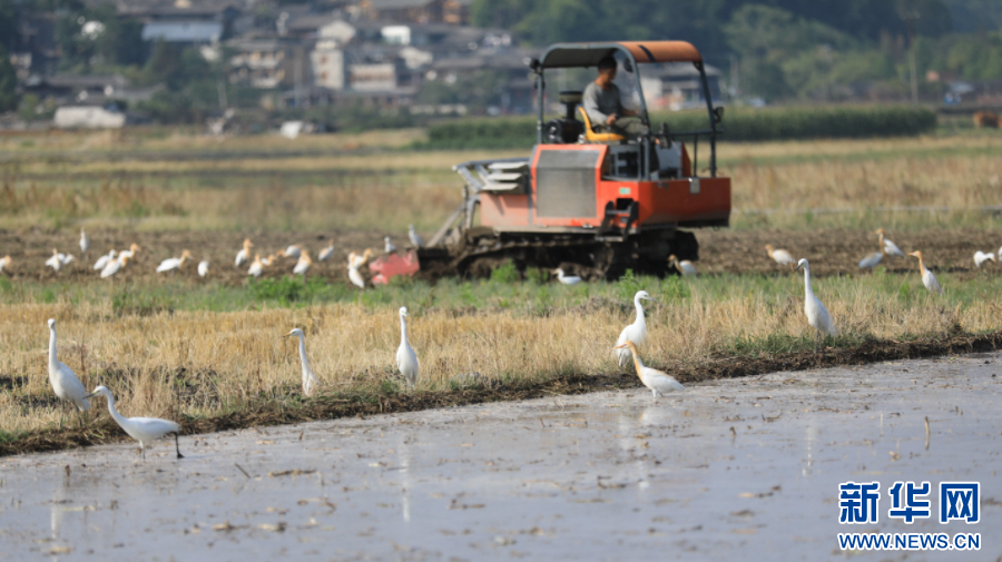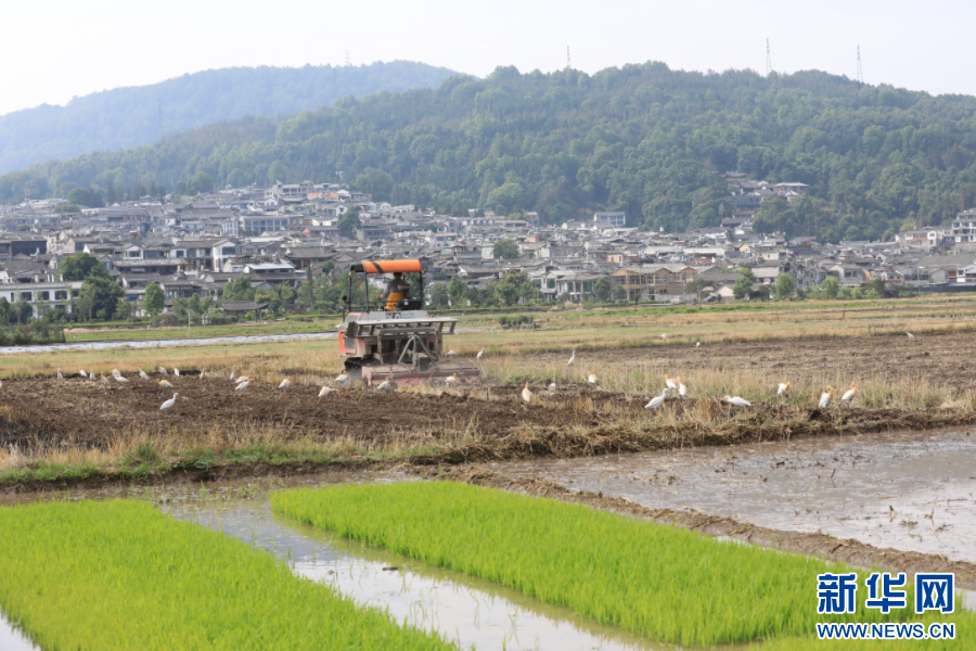 黃坡社區農民忙農耕,白鷺在田里覓食(5月10日攝)。新華網發(龔祖金 攝)