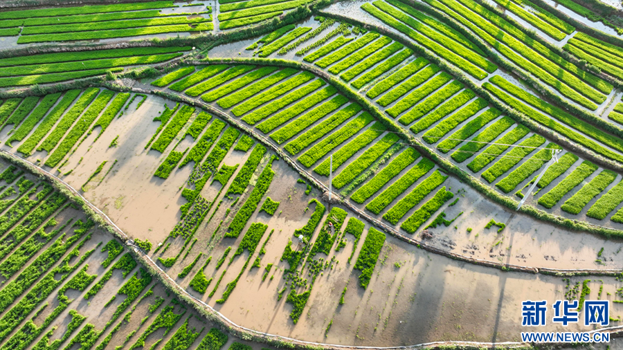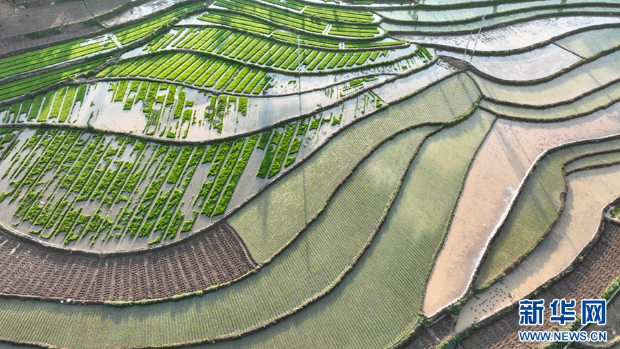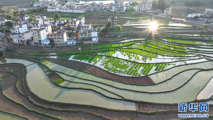 初夏時節,在云南省曲靖市沾益區天生壩村雨后的田野里,農民搶抓農時,忙著栽插秧苗,整理稻田。勞作的身影與阡陌農田、翠綠的秧苗、遠處的村莊,共同構成一幅美麗的鄉村田園畫卷。新華網發(孫文來 攝)
