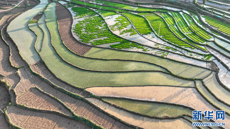在云南省曲靖市沾益區天生壩村,航拍雨后的田野(5月10日攝)。新華網發(孫文來 攝)