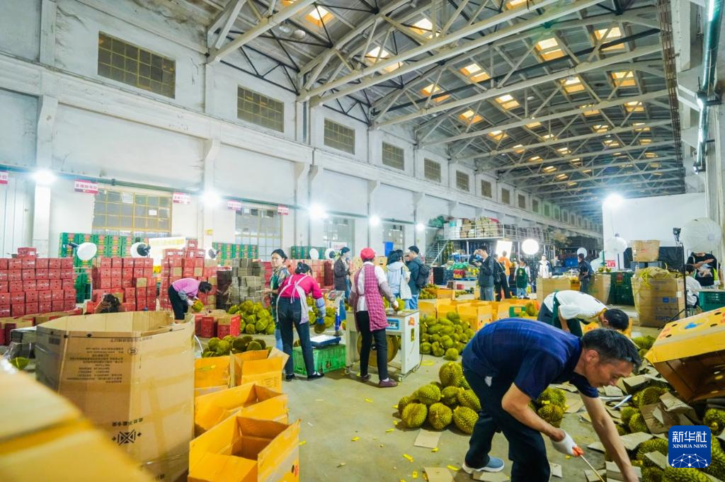 在云南思珺兒貿易有限公司助農基地里,一筐筐新鮮榴蓮、山竹散發出濃濃果香,工作人員直播、打包、運輸新鮮水果,一派繁忙的景象。