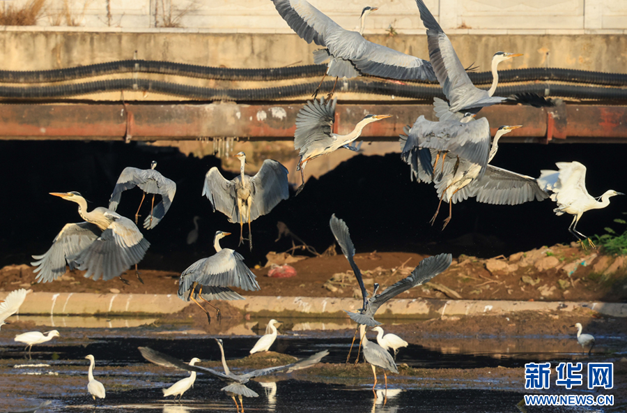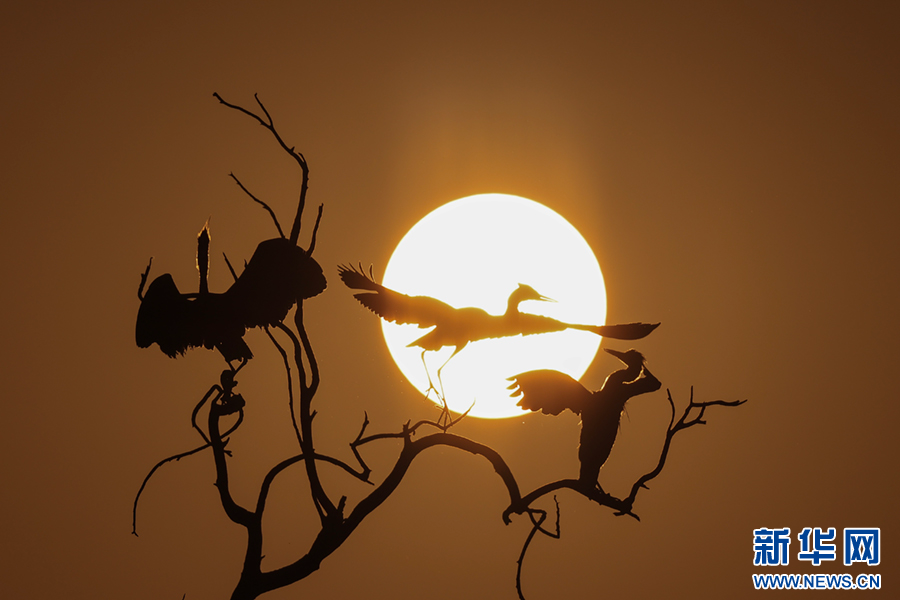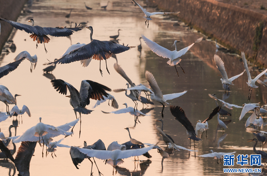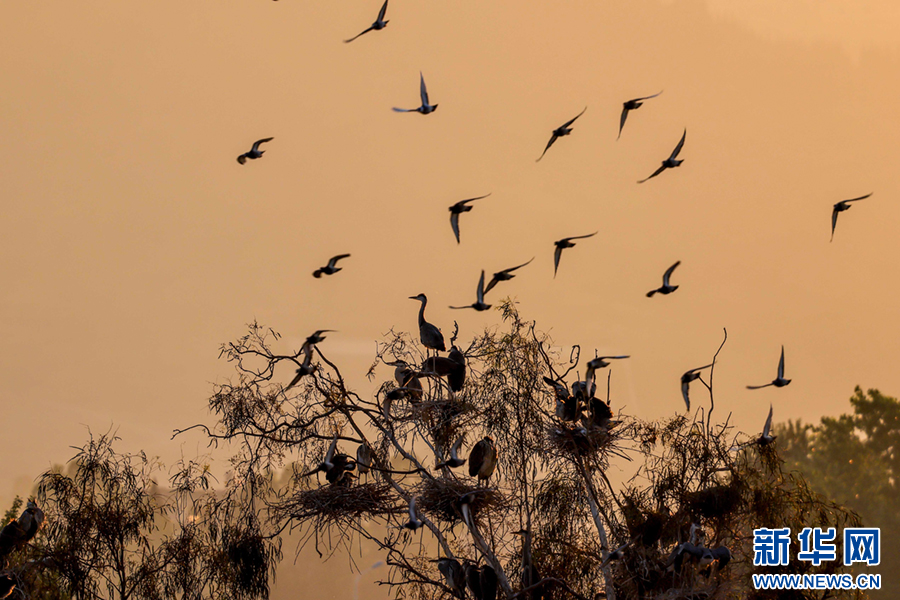 晨曦中,成群的鷺鳥翩翩飛舞(5月22日攝)。新華網發(孫文來 攝)