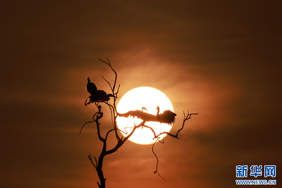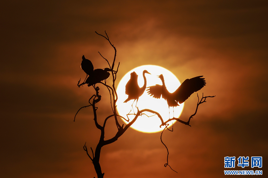 朝陽下,鷺鳥立枝頭(5月22日攝)。新華網發(孫文來 攝)