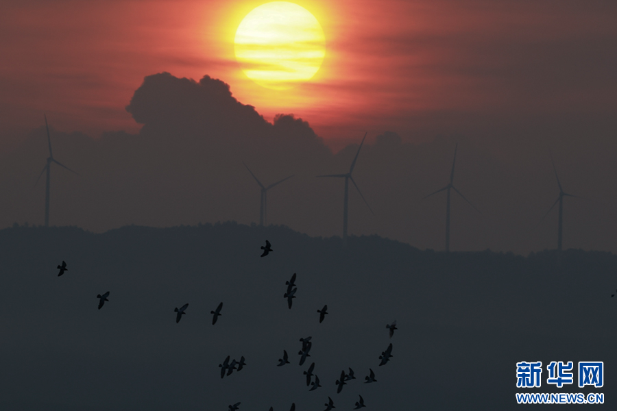 朝陽下,群鳥飛過(5月22日攝)。新華網發(孫文來 攝)