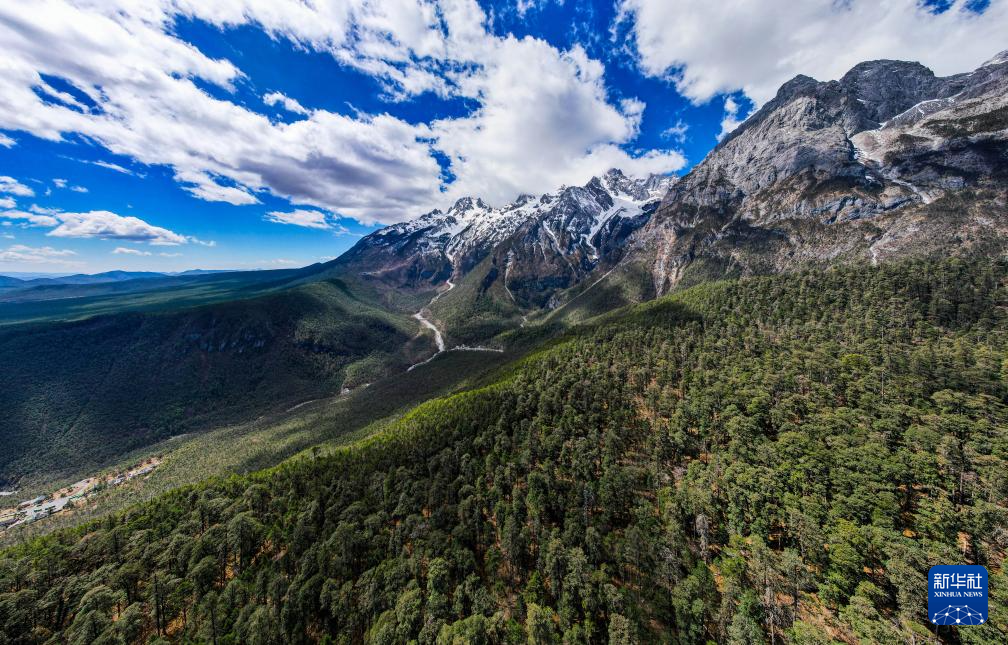 2024年3月28日拍攝的云南麗江森林生物多樣性國家野外科學觀測研究站云杉坪大樣地,遠處是玉龍雪山(無人機照片)。新華社記者 陳欣波 攝