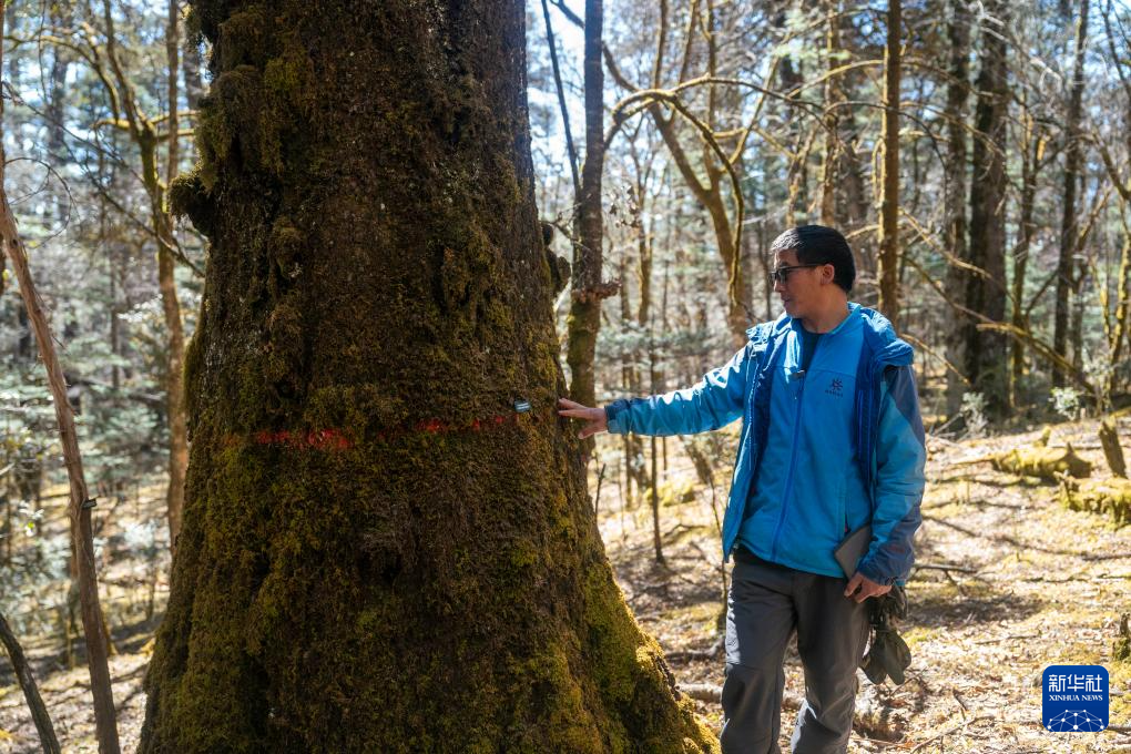 云南麗江森林生物多樣性國家野外科學觀測研究站工程師范中玉在云杉坪大樣地內查看一棵杉樹(2024年3月28日攝)。新華社記者 陳欣波 攝