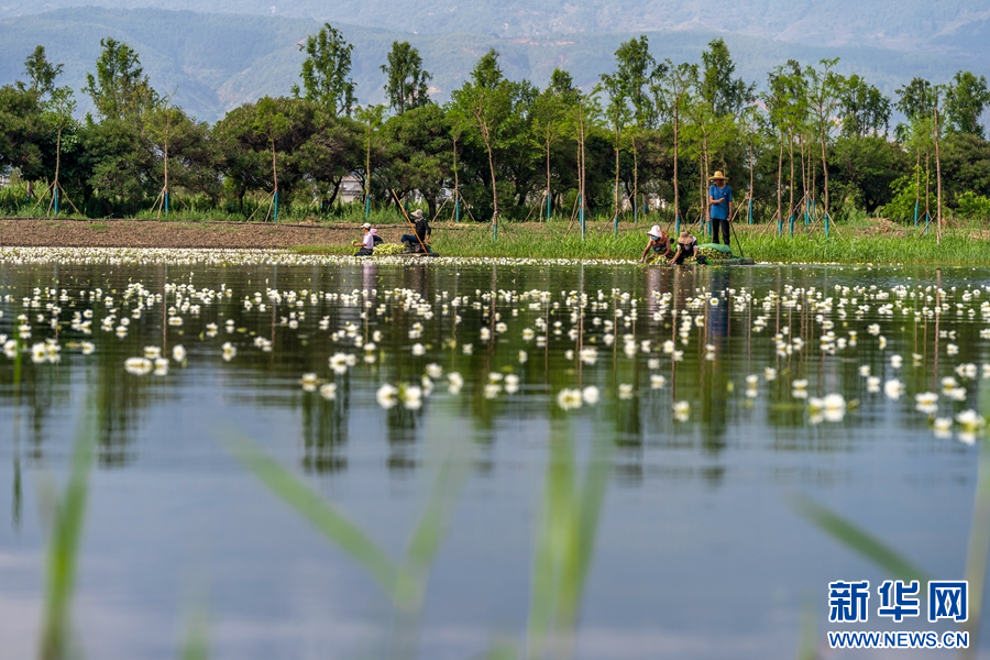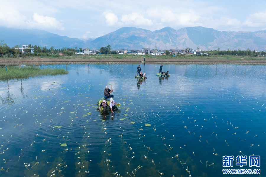 洱源縣右所鎮永安海菜種植基地,農戶在采收海菜(攝于6月5日)。新華網發(羅新才 攝)