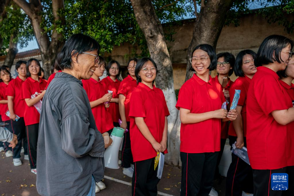 6月7日,張桂梅帶著低年級學生給準備出發參加高考的同學們加油鼓勁。