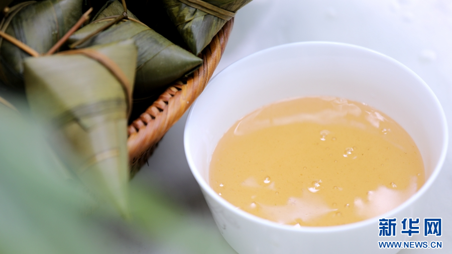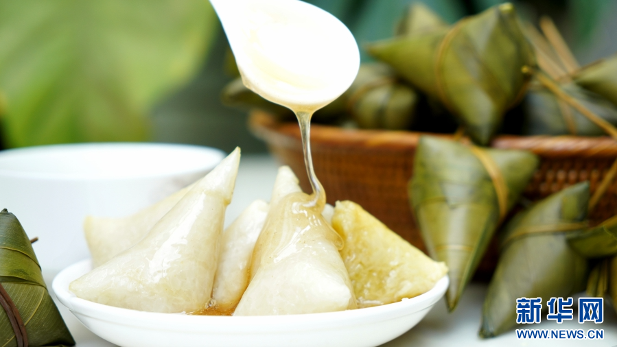 施甸粽子蘸麥芽糖汁很美味(6月4日攝)。新華網發(施甸縣融媒體中心供圖)