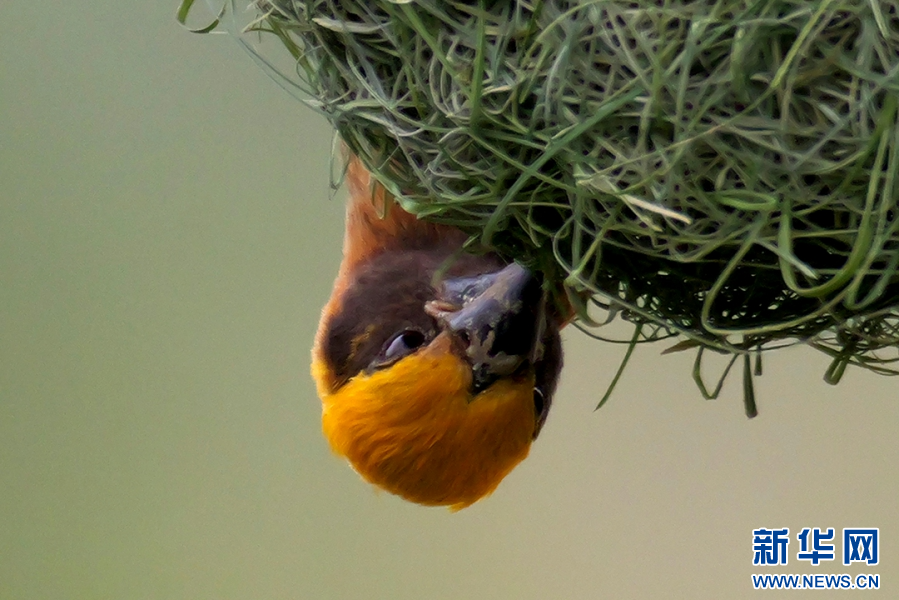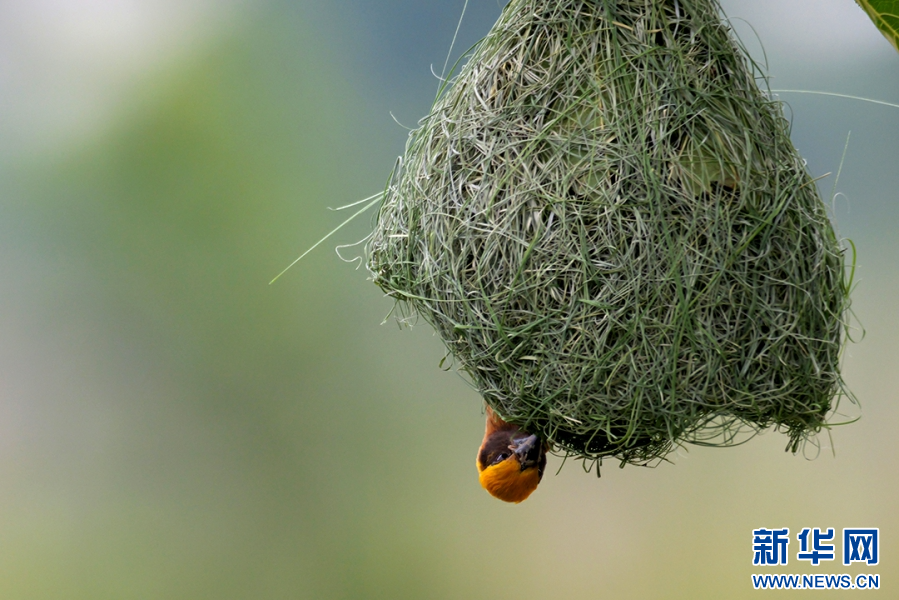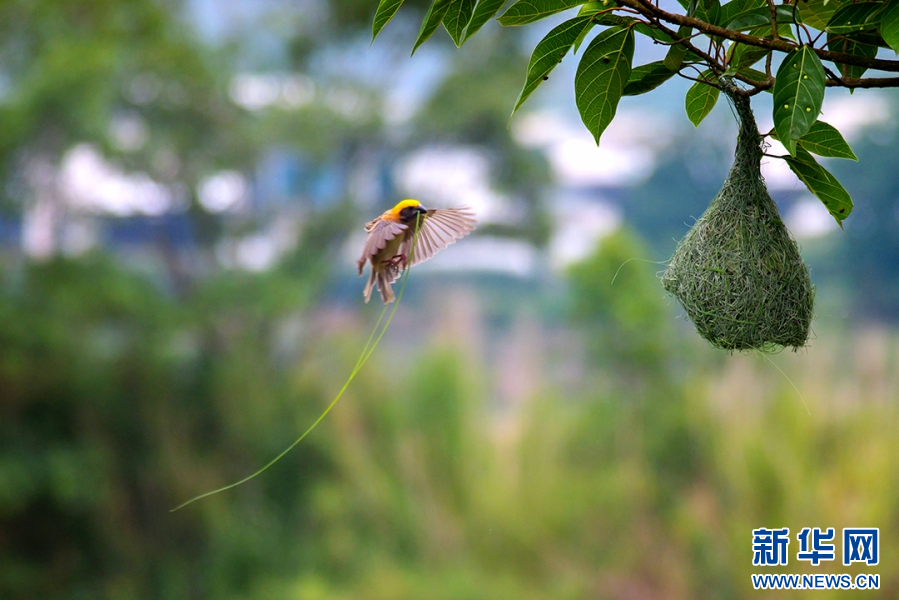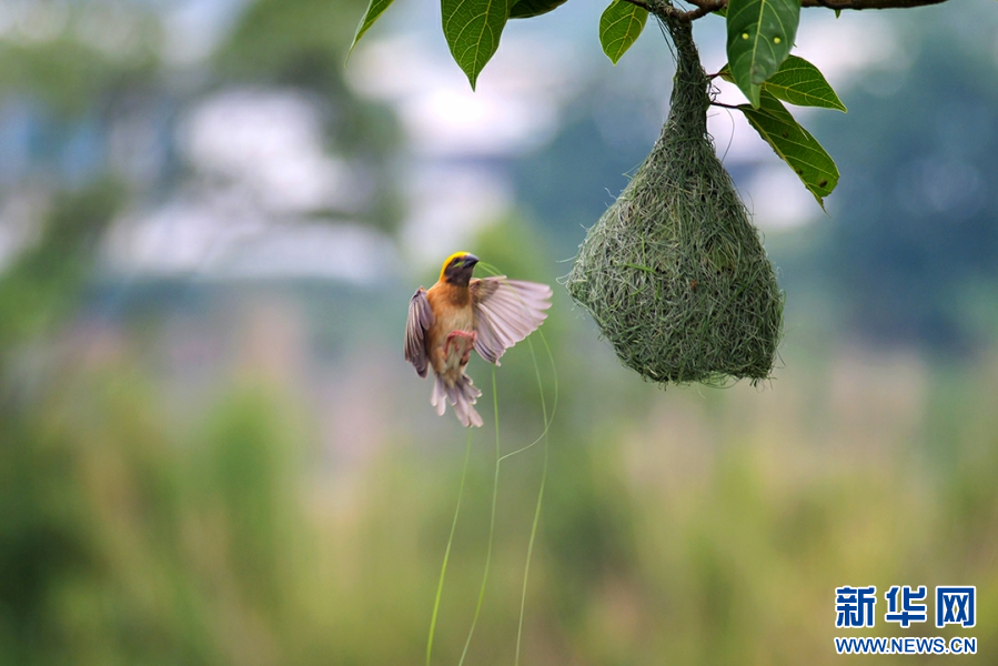 黃胸織布鳥正在筑巢(6月6日攝)。新華網發(昌寧縣融媒體中心供圖)