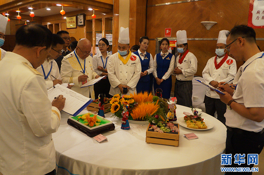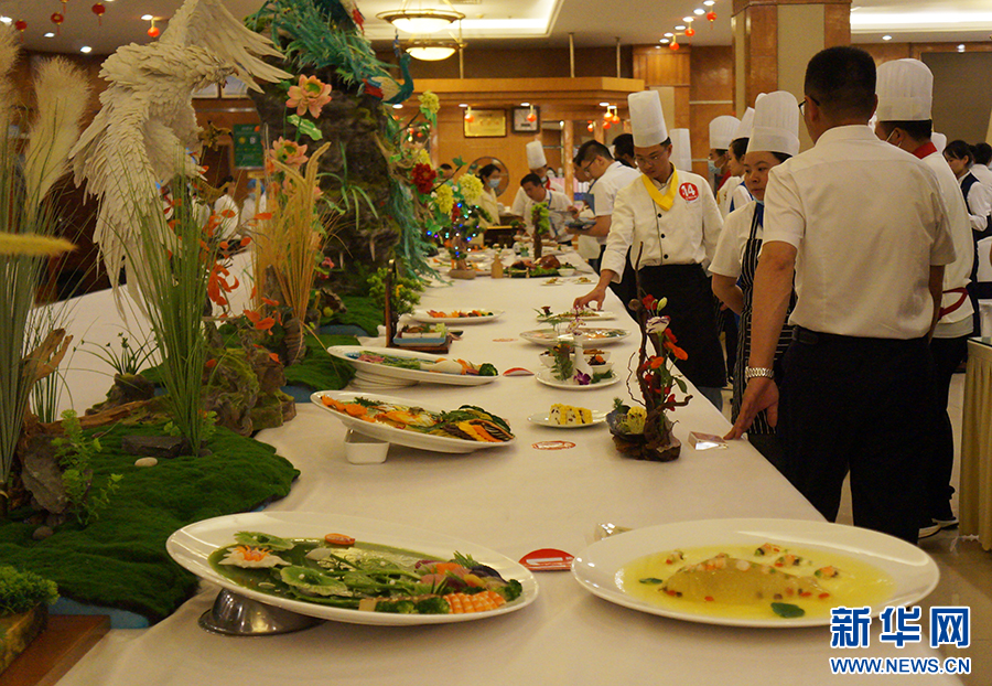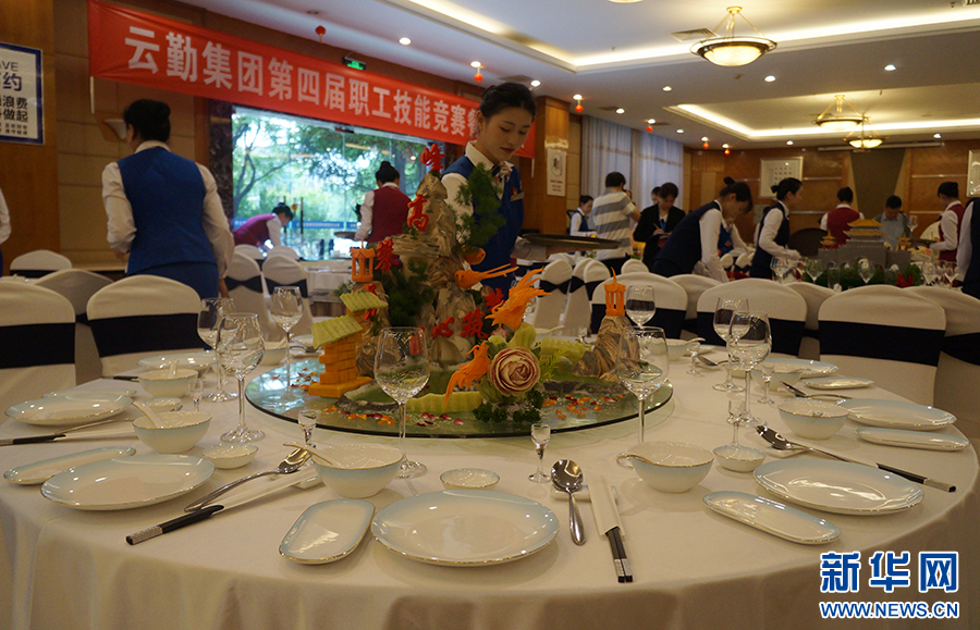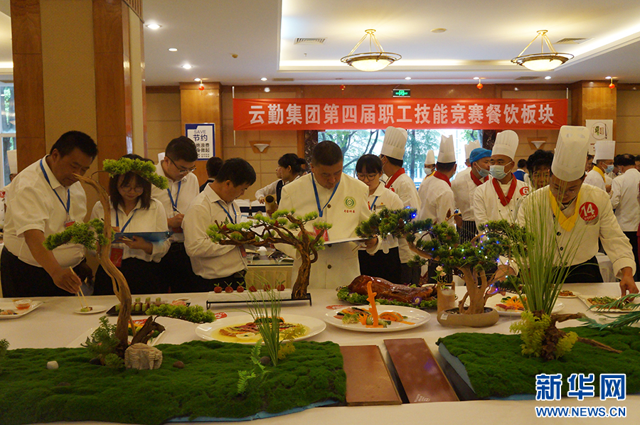 面條做的孔雀栩栩如生、蘿卜絲制作的龍雕刻精細……一道道美食色澤艷麗、擺盤精致,讓人眼花繚亂。這是6月15日,云南云勤服務集團有限責任公司(以下簡稱云勤集團)第四屆職工技能競賽的現場。