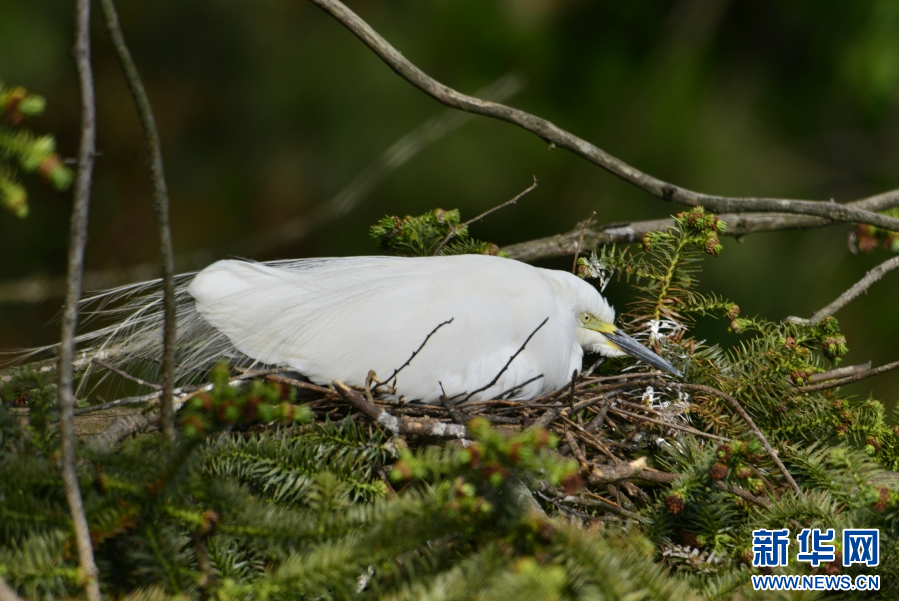 白鷺銜樹枝筑巢(6月11日攝)。新華網發(昌寧縣融媒體中心供圖)