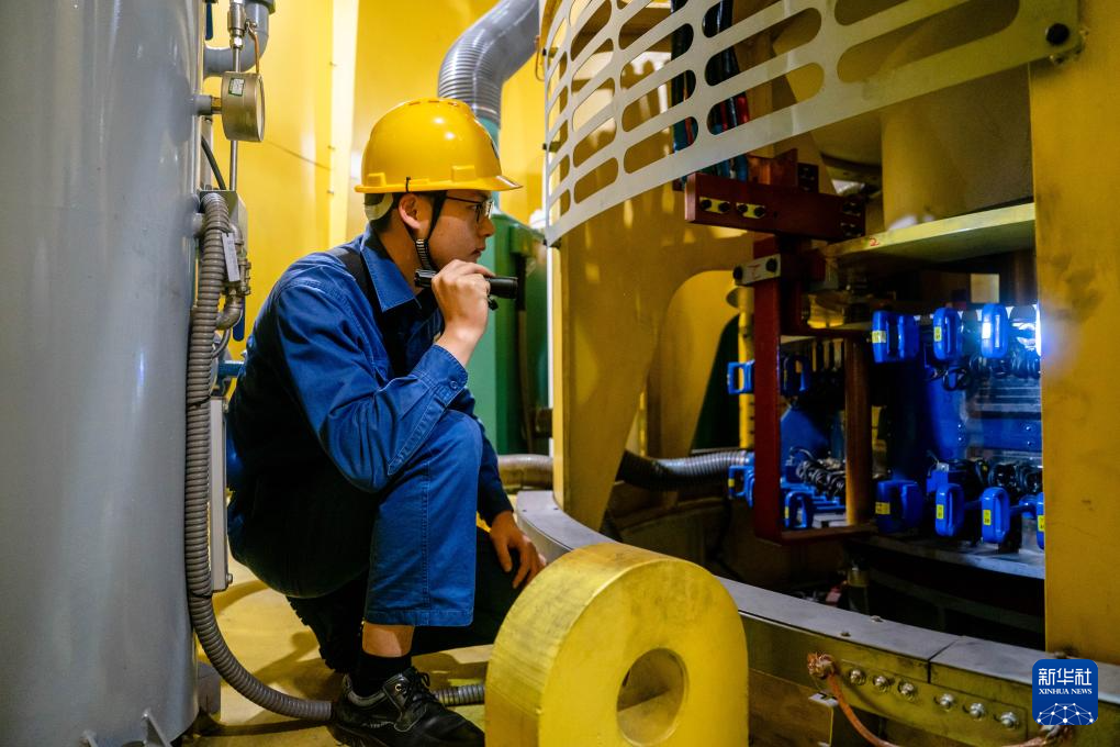 6月19日,工作人員在白鶴灘水電站左岸地下廠房發電機層滑環室檢查碳刷運行情況。