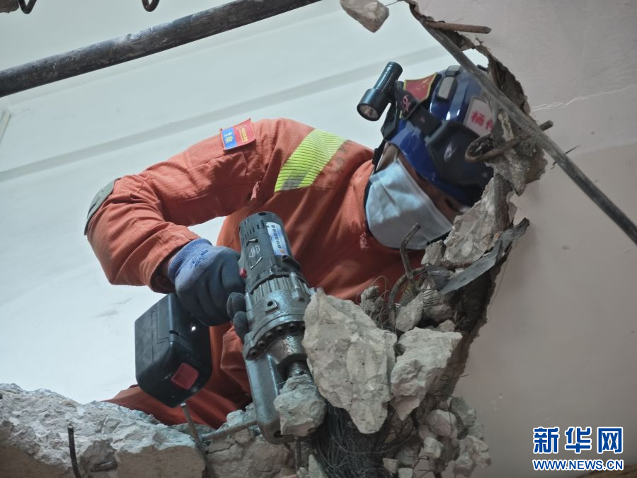 救援人員利用切割機打開救援通道,進行斜向救援(6月18日攝)。新華網發(駱銀文 攝)