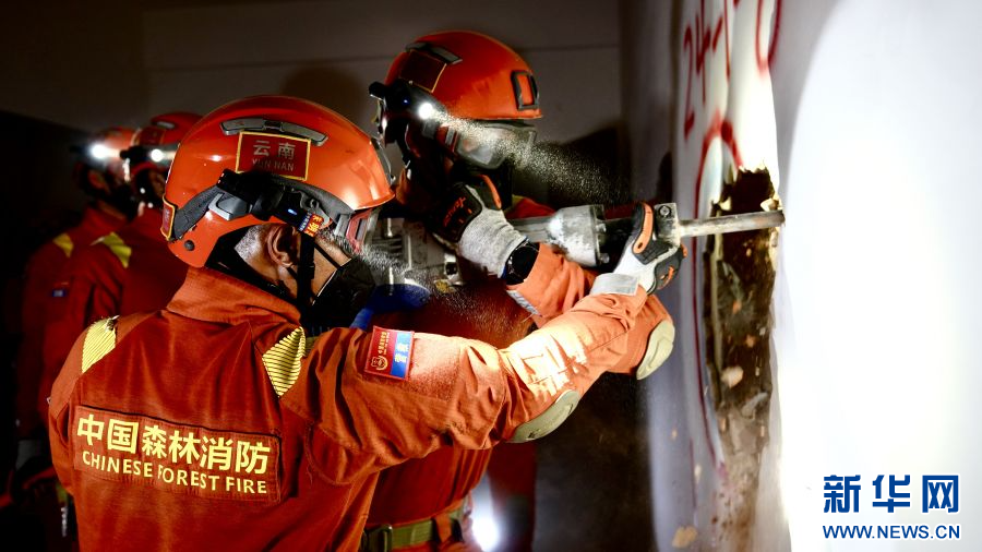 消防救援人員共同破開墻壁(6月18日攝)。新華網發(郭俊 攝)