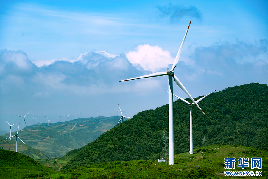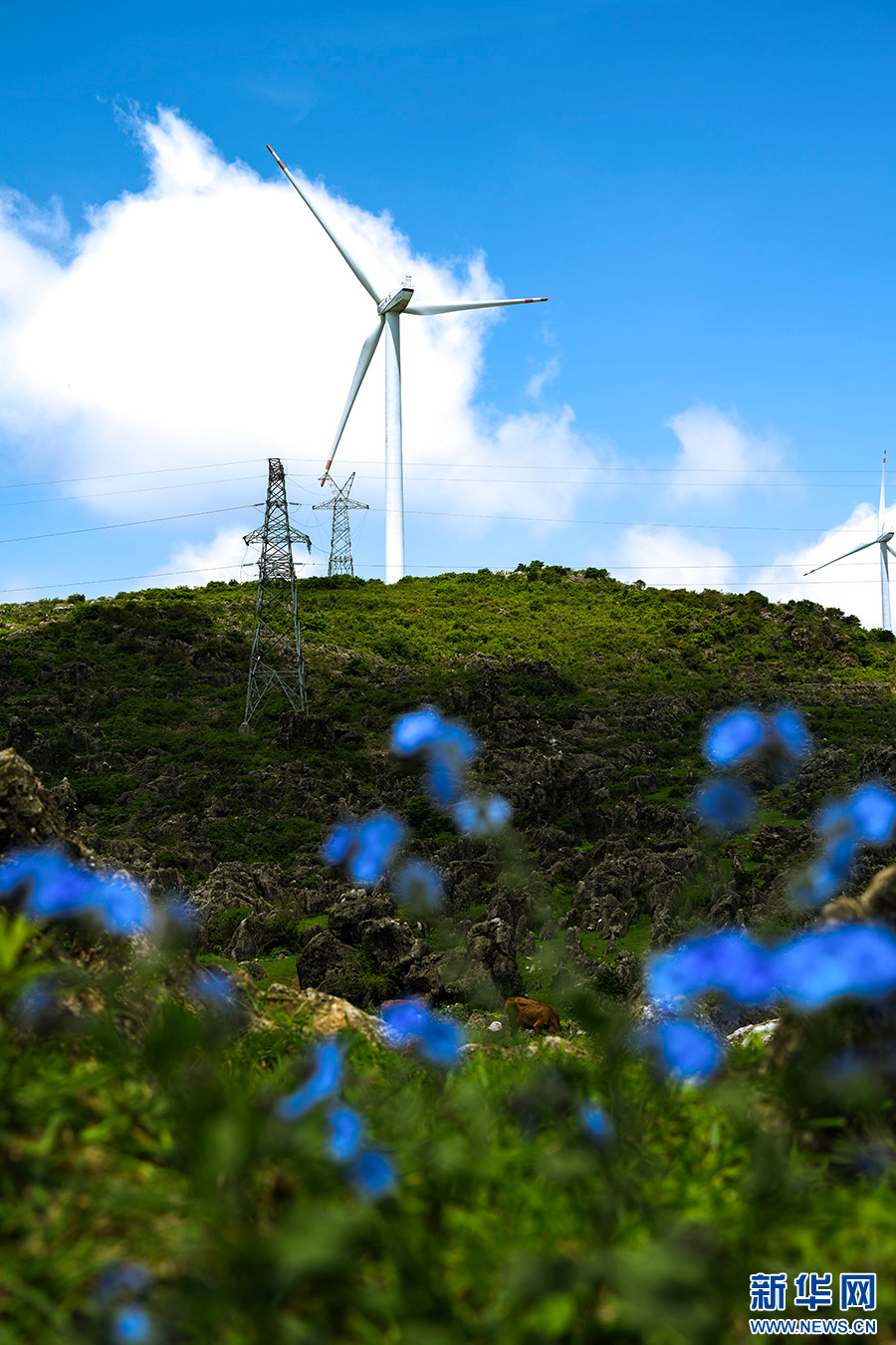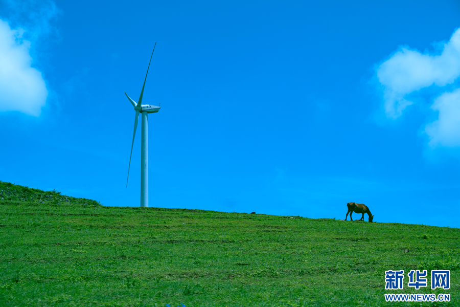 丘北縣舍得草場內,旋轉的風車與連綿不絕的高原草場構成了美麗的舍得風光(6月21日攝)。新華網發(劉起 攝)