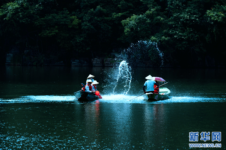 游客在普者黑景區乘船游玩,互相潑水嬉戲(6月21日攝)。新華網發(劉起 攝)