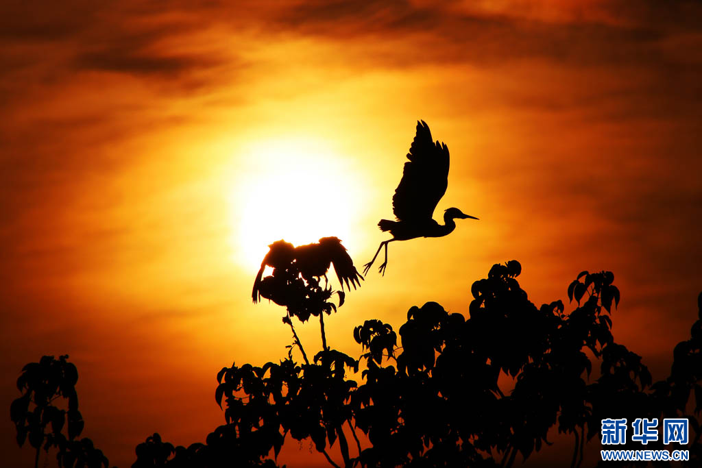朝陽下,蒼鷺振翅高飛(6月11日攝)。新華網發(趙樹龍 攝)