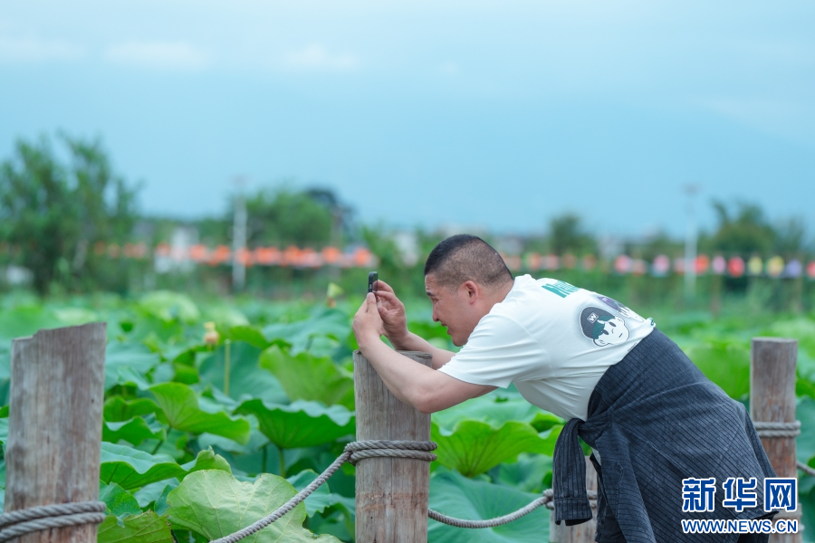 游客在荷塘邊拍照(7月14日攝)。新華網發(徐俊 攝)